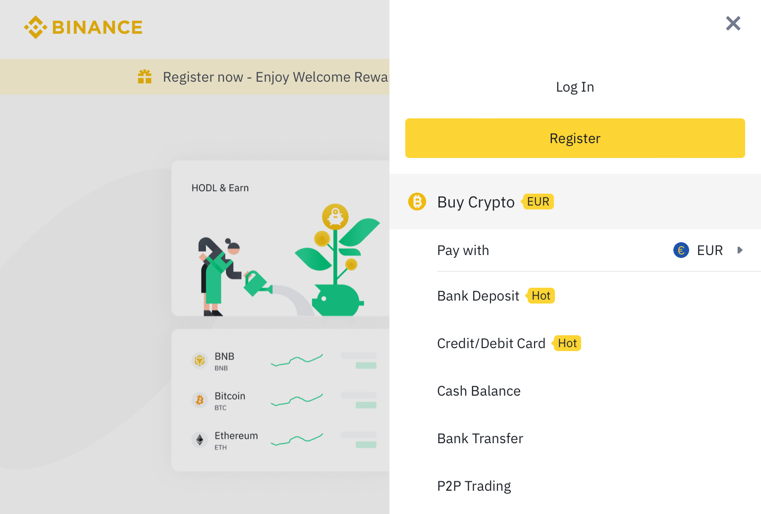 Tippe auf den Link “Krypto kaufen” oben links auf der Binance-Webseite, und du bekommst alle in deinem Land verfügbaren Optionen angezeigt.