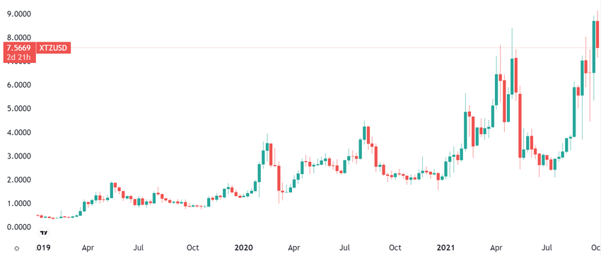 Wenn du XTZ Coin, die native Kryptowährung und das Governance-Token von Tezos, im Dezember 2018 im Wert von 1000 US-Dollar gekauft und am 4. Oktober 2021 verkauft hättest, hättest du einen Gewinn von 24.000 US-Dollar erzielt. Im Laufe der Jahre befand sich der Tezos Kurs auf einem Aufwärtstrend, allerdings mit regelmäßigen Buy-the-Dip-Gelegenheiten.