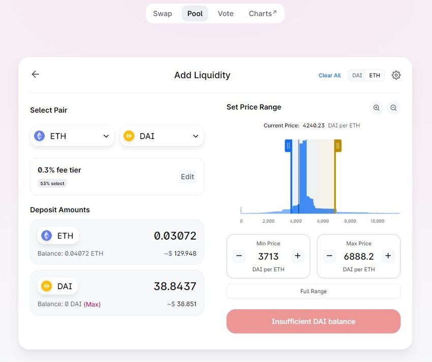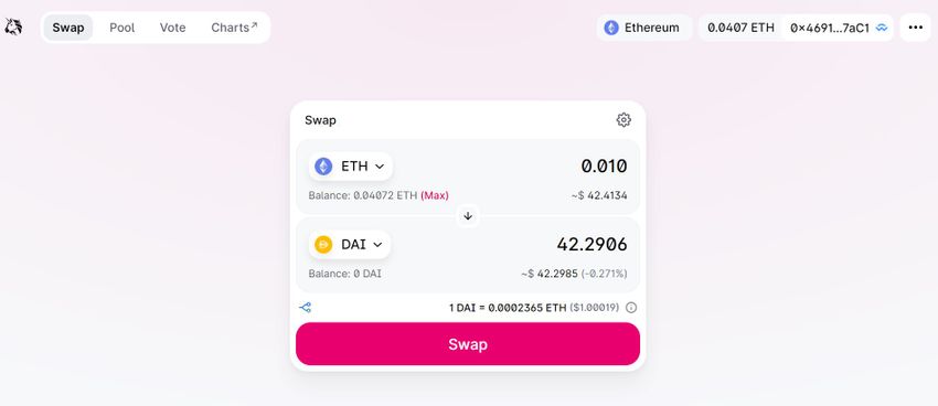 Nehmen wir an, du möchtest ETH gegen DAI tauschen. Wenn du einen bestimmten ETH-Betrag tauschen möchtest, dann musst du diesen Betrag in das ETH-Feld eingeben und wenn du einen bestimmten Betrag an DAI wünschst, kannst du diesen Betrag in das Feld DAI-Betrag eingeben.