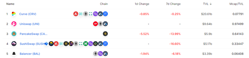 Die dezentralen AMM-Börsen werden nach dem Total Value Locked (TVL) in ihren Smart Contracts eingestuft.