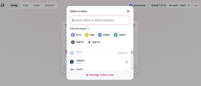 Zunächst musst du die Kryptowährung auswählen, die du tauschen möchtest. Du kannst Token anhand Namen oder Adresse suchen.