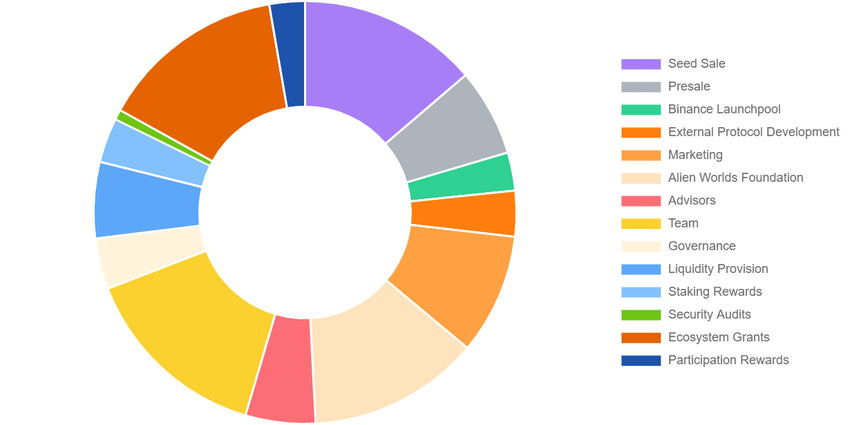 Insgesamt sind 10 Milliarden Alien Worlds Token (TLM) verfügbar, aber es ist unwahrscheinlich, dass diese Zahl erreicht wird, da Trilium mit einer sinkenden Inflationsrate arbeitet. Die Schätzung liegt bei maximal fünf Milliarden Token. Gemäß den Open-Source-Alien Worlds-Algorithmen geht alles erstellte Trilium zuerst an den Planeten und dann an die Spieler.