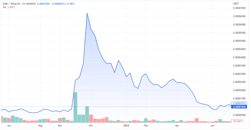 Genauso schnell wie FOMO die Preise in die Höhe treiben kann, können Panikverkäufe einen Absturz auslösen. Im Oktober 2022 wechselt DOGE den Besitzer um nur 0,06 US-Dollar und liegt damit über 90 % unter dem Rekordhoch von 0,75 US-Dollar, das es letztes Jahr erreichte. SHIB wird für 0,000001 US-Dollar gehandelt und liegt damit fast 90 % unter dem Rekordhoch von 2021.