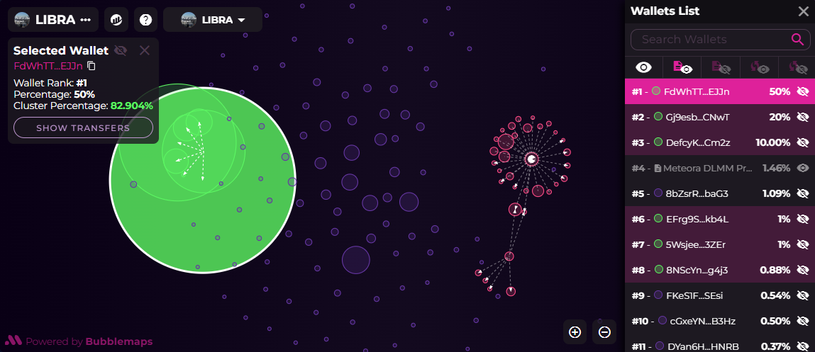 Das Bild unten zeigt die Verteilung von LIBRA. Jede Blase ist eine Wallets, und ihre Größe ist proportional zu der Anzahl der Token im Projekt. Die Pfeile stellen Transfers dar, und die Cluster sind die zugehörigen oder verbundenen Wallets. Hier können Sie sehen, dass der LIBRA-Token stark auf einige wenige Inhaber konzentriert ist.