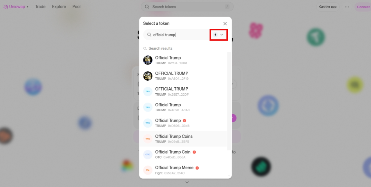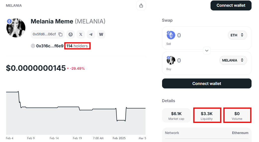 Im obigen Beispiel sehen Sie gefälschte TRUMP-Token. Da der offizielle TRUMP-Token jedoch auf Solana existiert, handelt es sich bei diesen Token auf Ethereum eindeutig um Meme Coin-Betrug.