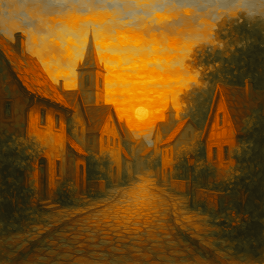 - Ölgemälde-Stil: “Ein ruhiges europäisches Dorf bei Sonnenuntergang, im Stil der Ölmalerei.”
