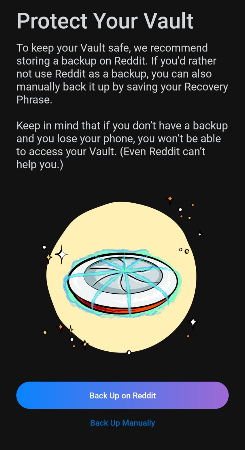 Schritt 4: Als Nächstes wirst du von Reddit aufgefordert, deinen Tresor durch die Erstellung einer Sicherungskopie zu schützen. Hier hast du zwei Möglichkeiten. Du kannst das Backup auf Reddit erstellen oder deine Wiederherstellungsphrase manuell speichern (bzw. sie wortwörtlich auf Papier niederschreiben)
