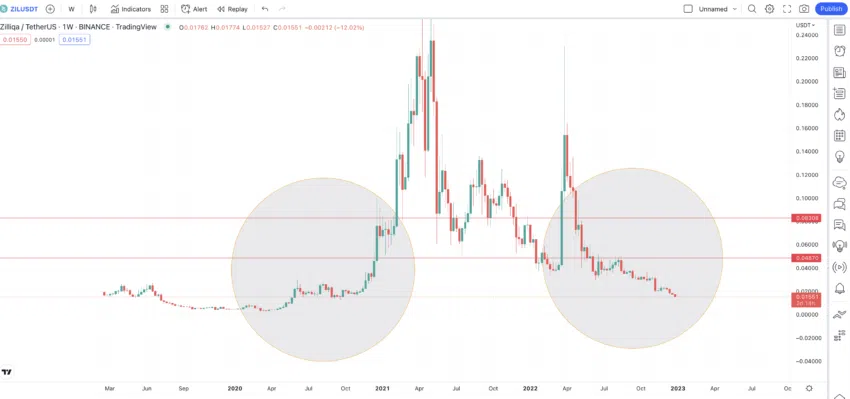 Ein Vergleich der ersten beiden Kreise zeigt, dass Zilliqa noch kein Tief erreicht hat. Im ersten Teil der Formation ist die übliche runde Bodenbildung zu erkennen. Für eine langfristige Zilliqa Prognose müssen wir nun das nächste Tief und die darauf folgenden Hochs lokalisieren.
