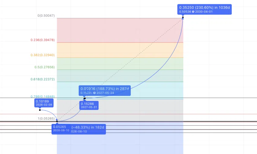 Wir haben also das Tief im Jahr 2026 und das Hoch im Jahr 2027. Für die Zilliqa Prognose bis 2030 verbinden wir die Punkte mit dem Fib-Indikator. Bei gleichem Wachstum ergibt der Kurs für 2030 ein neues Allzeithoch von 0,500 US-Dollar (Fibonacci-Indikatoren geben Hinweise auf Kursbewegungen).