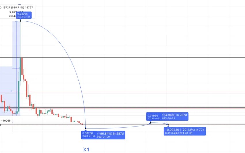 Eine Prognoselinie von X1 setzt also das Hoch bis Ende 2023 bei 0,01934 US-Dollar an. Wir können diesen Schlüsselwert als A1 kennzeichnen.