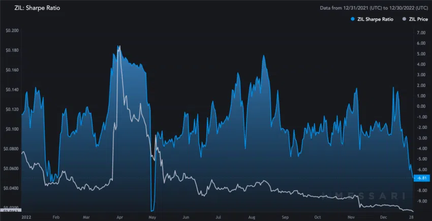 Wer in Zilliqa investieren möchte, sollte sich das jährliche Sharpe Ratio (ein Renditemaß zum Vergleich der Performance von Vermögensverwaltern) im unteren Chart ansehen. Ende März 2022 erreichte ZIL einen Wert von über 5,5. Auch wenn der Ziliqa Kurs zu diesem Zeitpunkt nach oben getrieben wurde, befindet er sich seitdem in einem Abwärtstrend. Und das, obwohl die Sharpe Ratio bis Dezember 2022 mehrmals über vier lag.