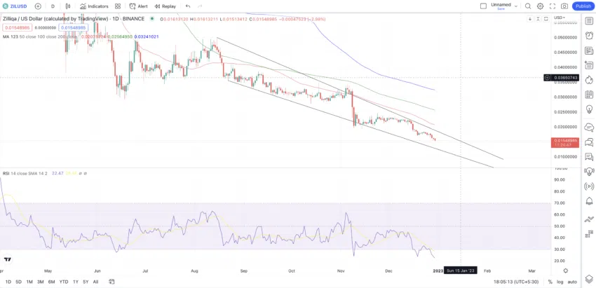 Der ZIL Coin wird innerhalb eines fallenden Kantenmusters gehandelt. Wenn er über die obere Trendlinie ausbricht, könnte das Muster bullisch sein. Darüber hinaus befindet sich der RSI auf dem Tageschart im stark überverkauften Bereich, was auf steigende Preise hindeuten könnte. Der Relative Strength Index (RSI) misst die Geschwindigkeit und das Ausmaß der jüngsten Kursentwicklung eines Vermögenswertes.
