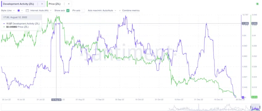 Die Zukunft eines Smart-Contract-Ökosystems wie dem von ZIL hängt stark von seiner Entwicklungstätigkeit ab. Aktuell erreichen sowohl der Kurs als auch die Entwicklungsaktivität neue Tiefs. Historische Daten zeigen jedoch einen Aufwärtstrend des Kurses, wenn die Entwicklungsaktivität ein Hoch erreicht. Dies war auch im August der Fall. Sowohl die Entwicklungsaktivität als auch der Kurs von ZIL stiegen an.
