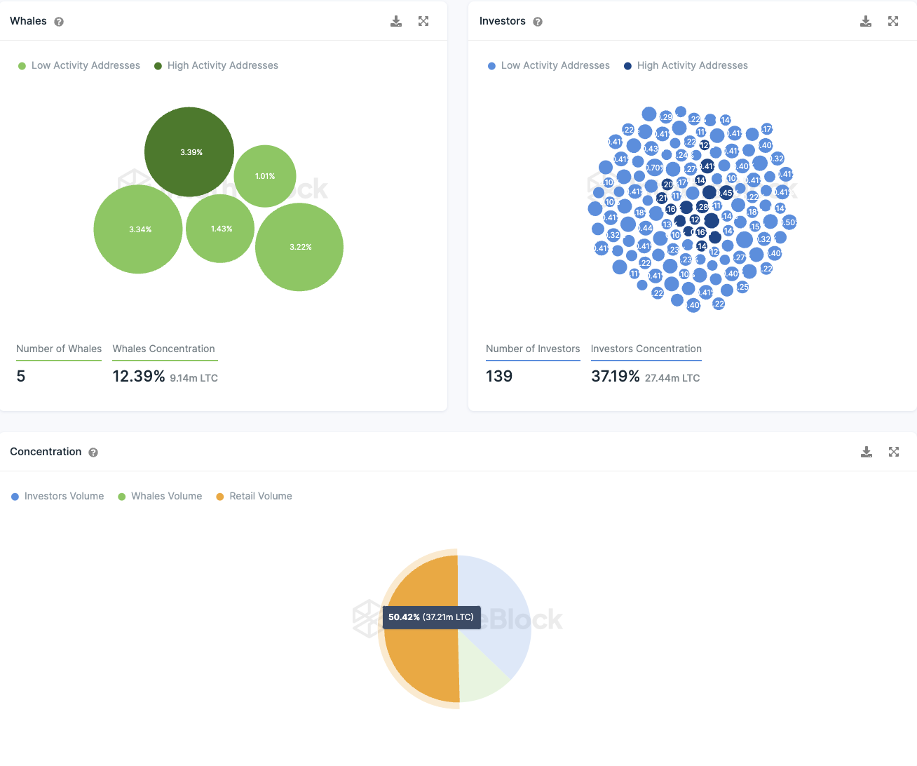 Etwa die Hälfte aller im Umlauf befindlichen Litecoins befindet sich im Besitz von Kleinanlegern. Nur etwa 12,39 % der gesamten Token liegen bei den sogenannten “Walen”, also den Adressen, die mehr als 1 % des gesamten Token-Angebots besitzen. Interessanterweise gibt es nur fünf solcher “Wale”, was im Vergleich recht gering ist. Hingegen sieht es bei den Großinvestoren, die zwischen 0,1 % und 1 % des zirkulierenden Angebots besitzen, anders aus. Hier gibt es etwa 139 Adressen, die gemeinsam mehr als 37 % der Token besitzen.