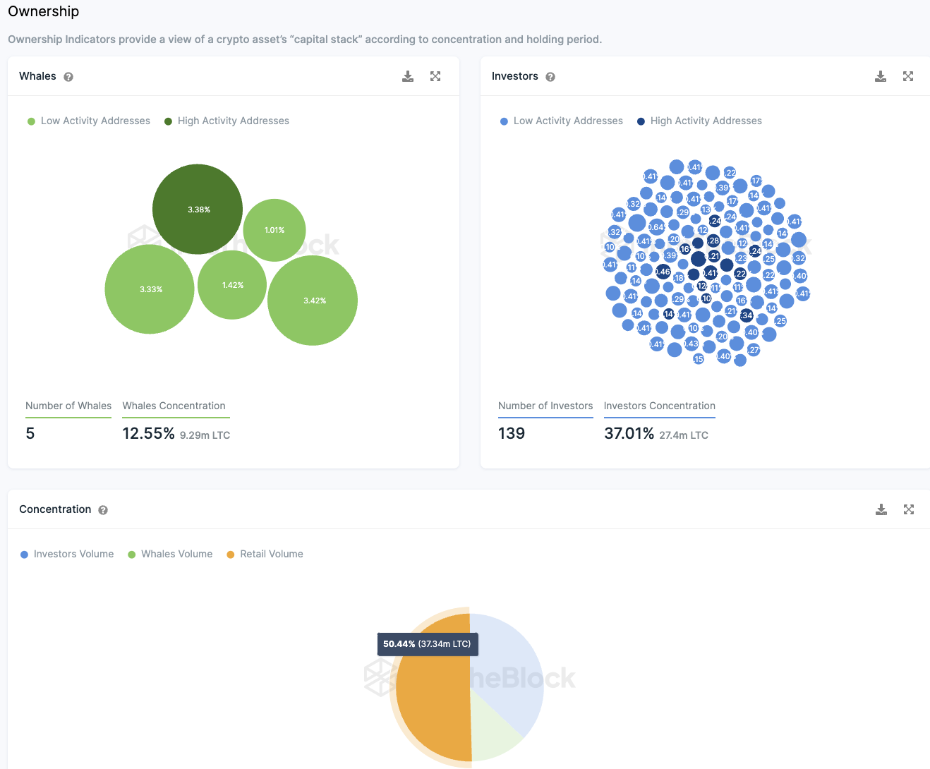 Ungefähr die Hälfte aller im Umlauf befindlichen Litecoins sind im Besitz von Kleinanlegern. Nur etwa 12,55 % des gesamten Tokenbestands sind in den Händen der sogenannten “Wale” – Adressen, die mehr als 1% aller Tokens besitzen. Diese “Wale” sind relativ wenige, es gibt nur fünf von ihnen. Im Vergleich dazu gibt es eine größere Anzahl von Großinvestoren, die zwischen 0,1% und 1% der umlaufenden Tokens besitzen. Etwa 139 Adressen fallen in diese Kategorie und sie halten zusammen mehr als 37 % der Tokens.