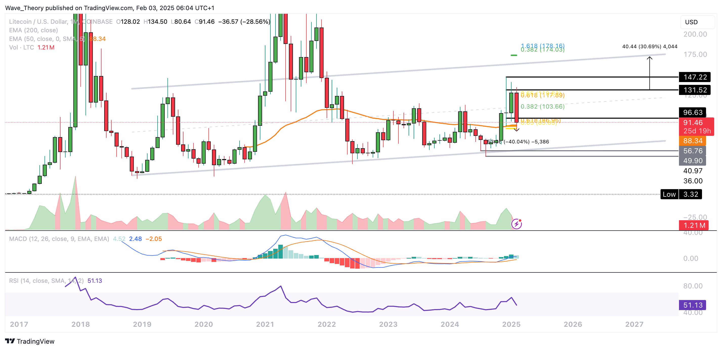 Der RSI zeigt sich dabei neutral und die MACD Linien sind noch bullisch überkreuzt. Darüber hinaus fungiert der 50-Monate-EMA bei rund 88,3 USD als zusätzliche Unterstützung.