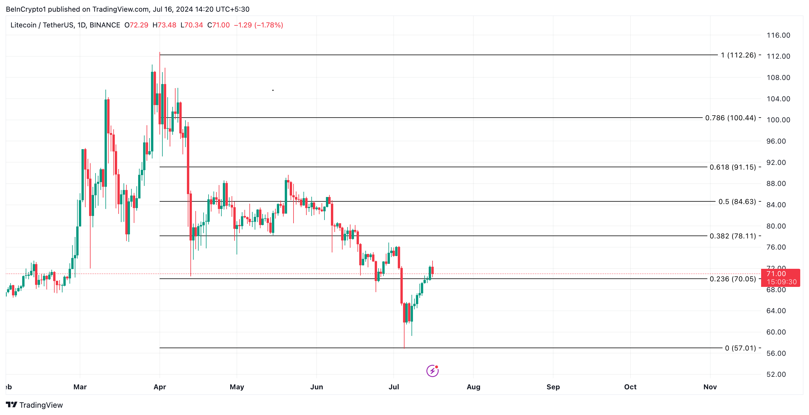 SponsoredWenn dies geschieht, könnte der Litecoin Kurs auf 70 USD am 0,236 Fibonacci-Retracement-Level fallen.
