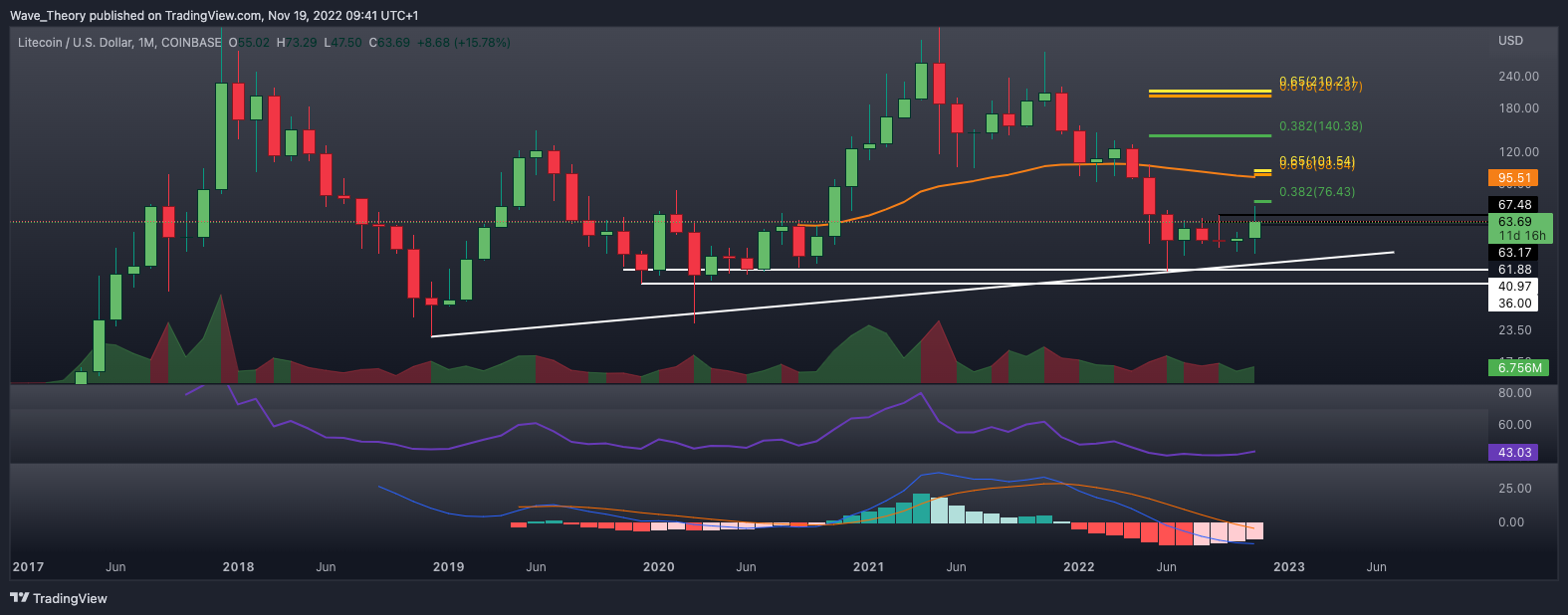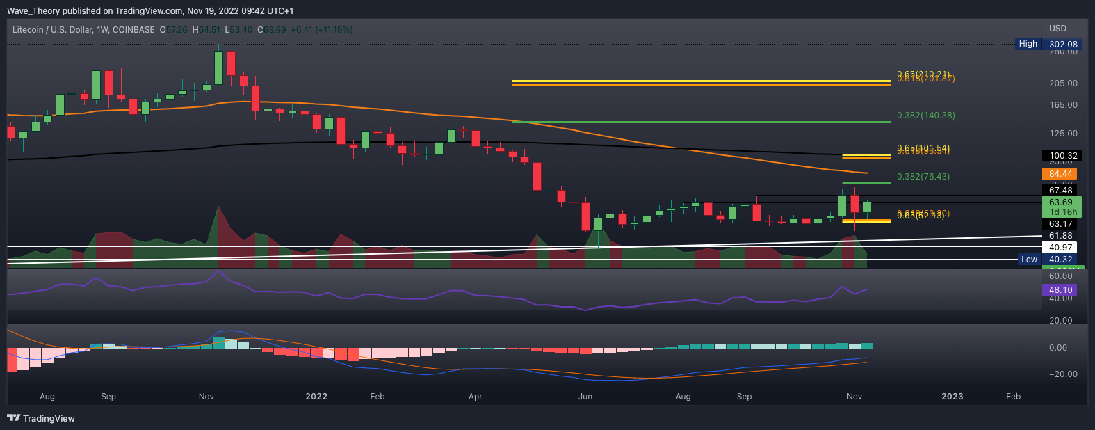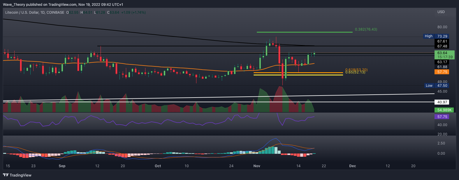 Nachdem der Litecoin Kurs zuvor am 200-Tage-EMA bei rund 68 USD bärisch abgewiesen wurde, kehrte er zur Golden Ratio Unterstützung bei rund 52 USD zurück, um dort abzuprallen und die Aufwärtsbewegung fortzusetzen.