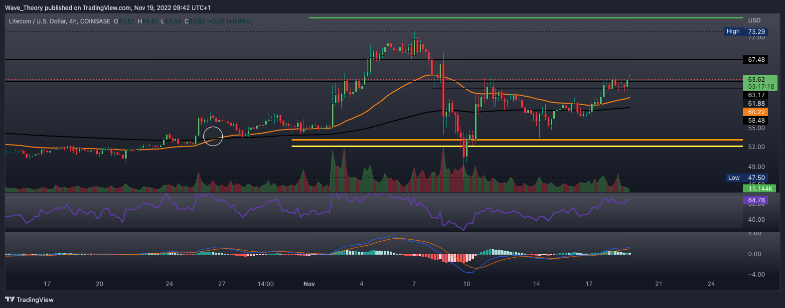 Der RSI zeigt sich währenddessen neutral. LTC stößt jetzt zwischen 63 USD und 68 USD auf signifikanten Widerstand und sollte LTC diesen Widerstand hinter sich lassen, wartet bei rund 76,5 USD signifikanter Fib Widerstand.