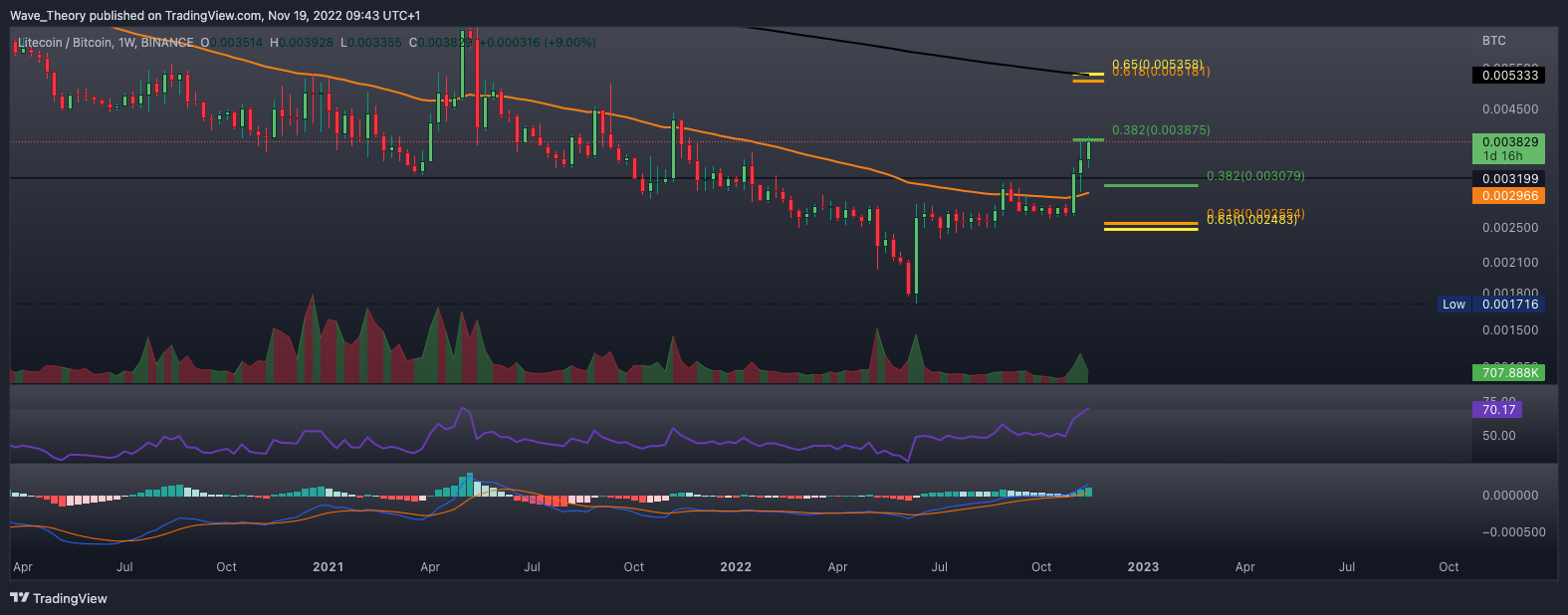 Sollte LTC jetzt am 0,382 Fib Widerstand bei rund 0,003875 BTC abgewiesen werden, warten bei rund 0,00308 BTC und bei rund 0,0025 BTC die nächsten signifikanten Fibonacci Unterstützungen.