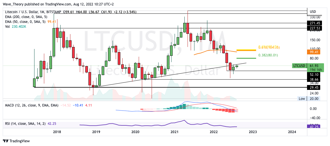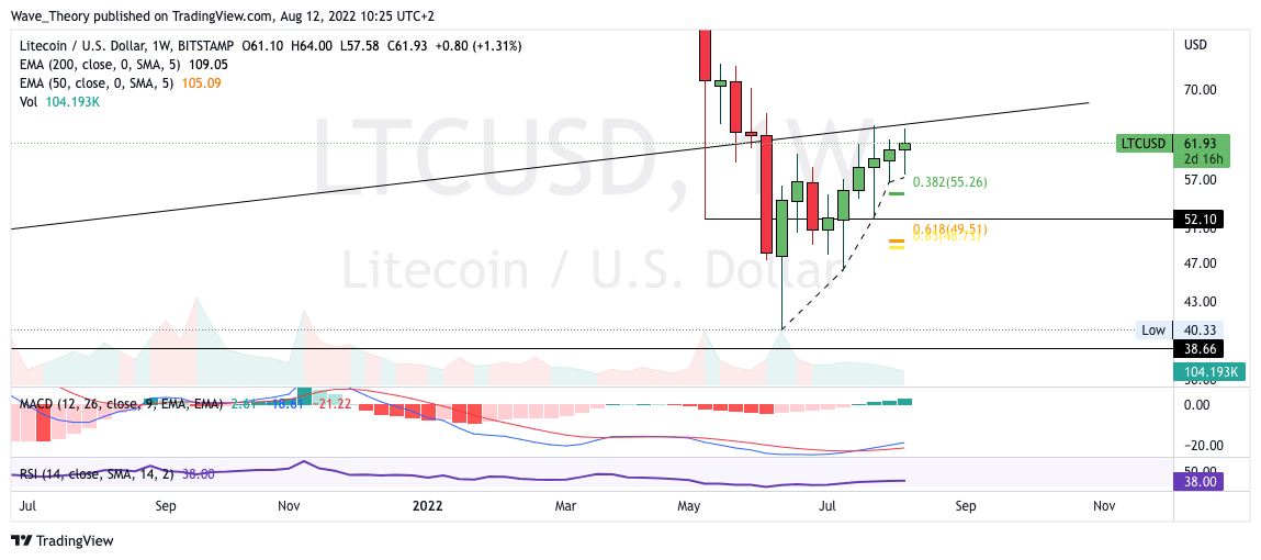 Der Litecoin Kurs befindet sich noch immer an der Trendlinie, an welcher er im letzten Monat abgewiesen wurde. Sollte LTC die Trendlinie bullisch durchbrechen, könnte er zu den nächsten Fib Niveaus bei rund 80 USD oder gar 105 USD steigen, wobei der 50-Monate-EMA bei rund 100 USD als signifikanter Widerstand fungiert.