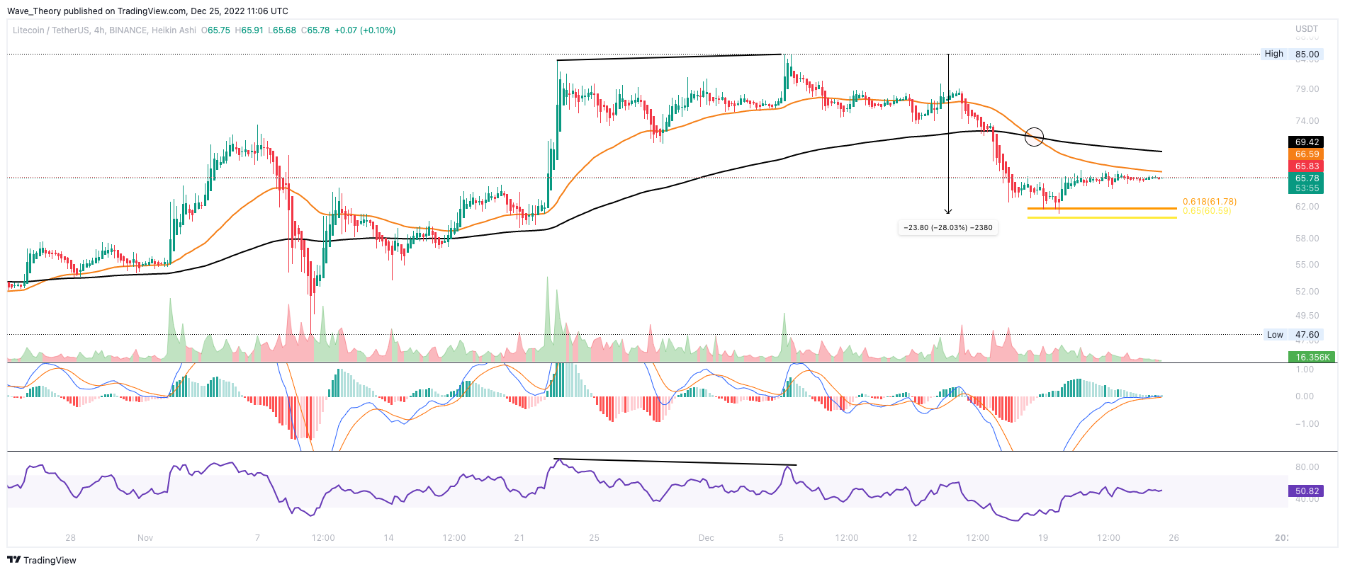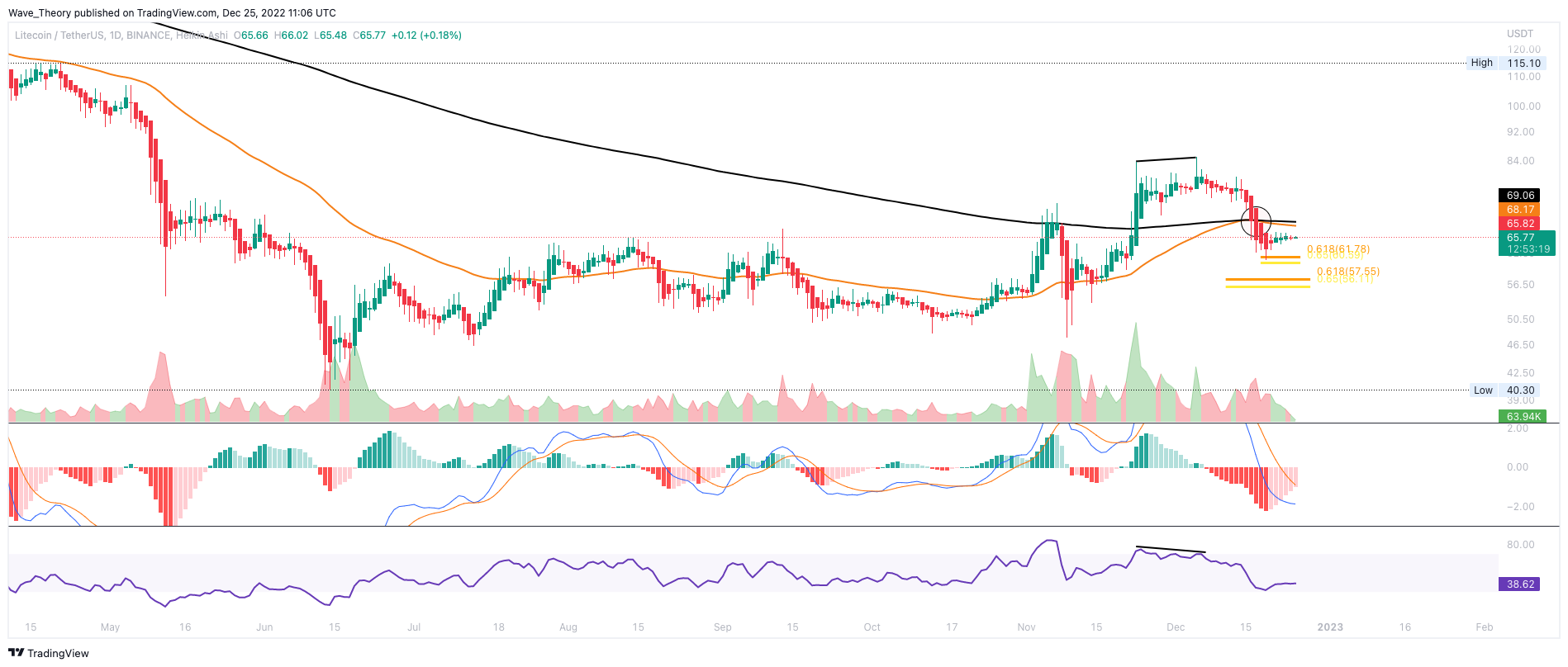 Der LTC Kurs ist auf rund 61 USD gefallen, um an der Golden Ratio Unterstützung abzuprallen