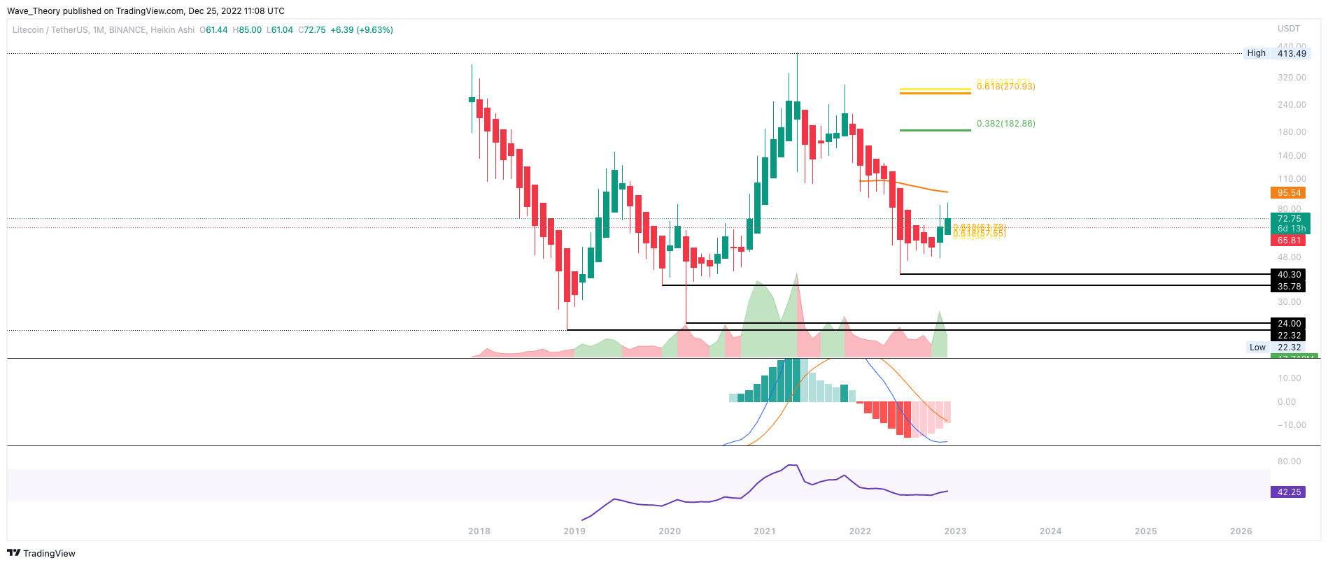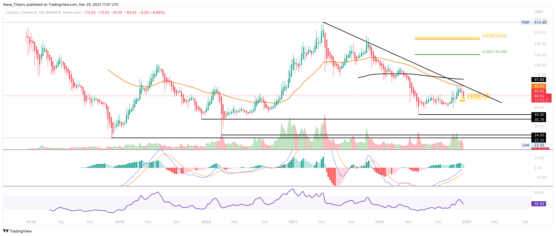 Sollte Litecoin die Fib Unterstützungen bärisch brechen, findet LTC spätestens zwischen 38,66 USD und 52,1 USD signifikante Unterstützung. “