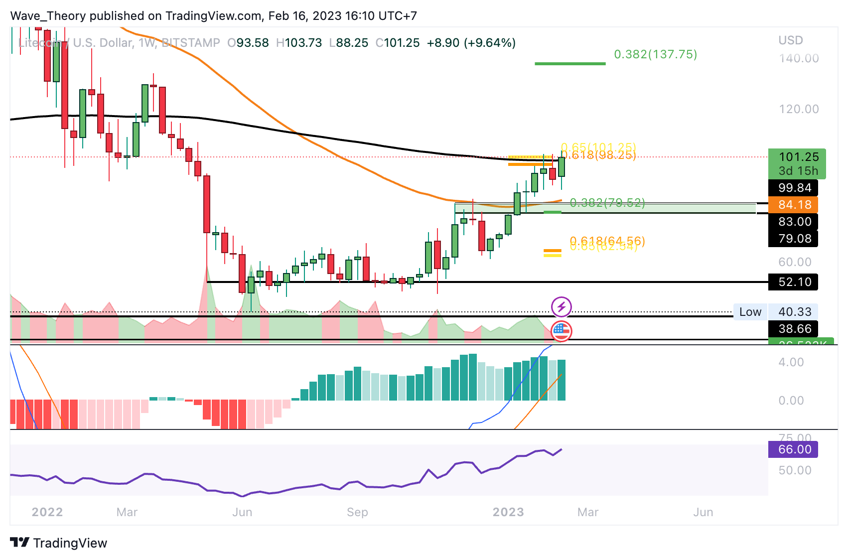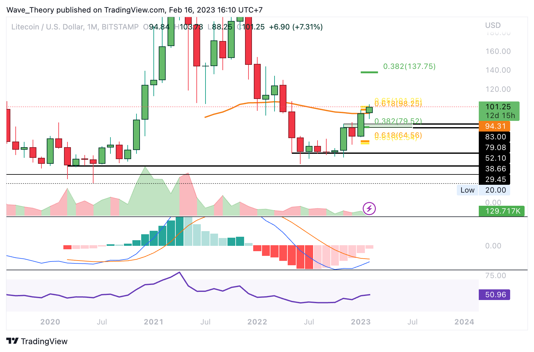 In der letzten LTC Kurs Prognose, welche bereits zehn Tage zurückliegt, schrieben wir: “Der Litecoin Kurs erreichte die Golden Ratio an der 100 USD Marke und befindet sich damit knapp über dem 50-Monate-EMA, welcher bei rund 94 USD liegt. Darüber hinaus tickt das Histogramm des MACDs seit einigen Monaten bullisch höher und auch die MACD Linien könnten sich im Monatschart bald bullisch überkreuzen.