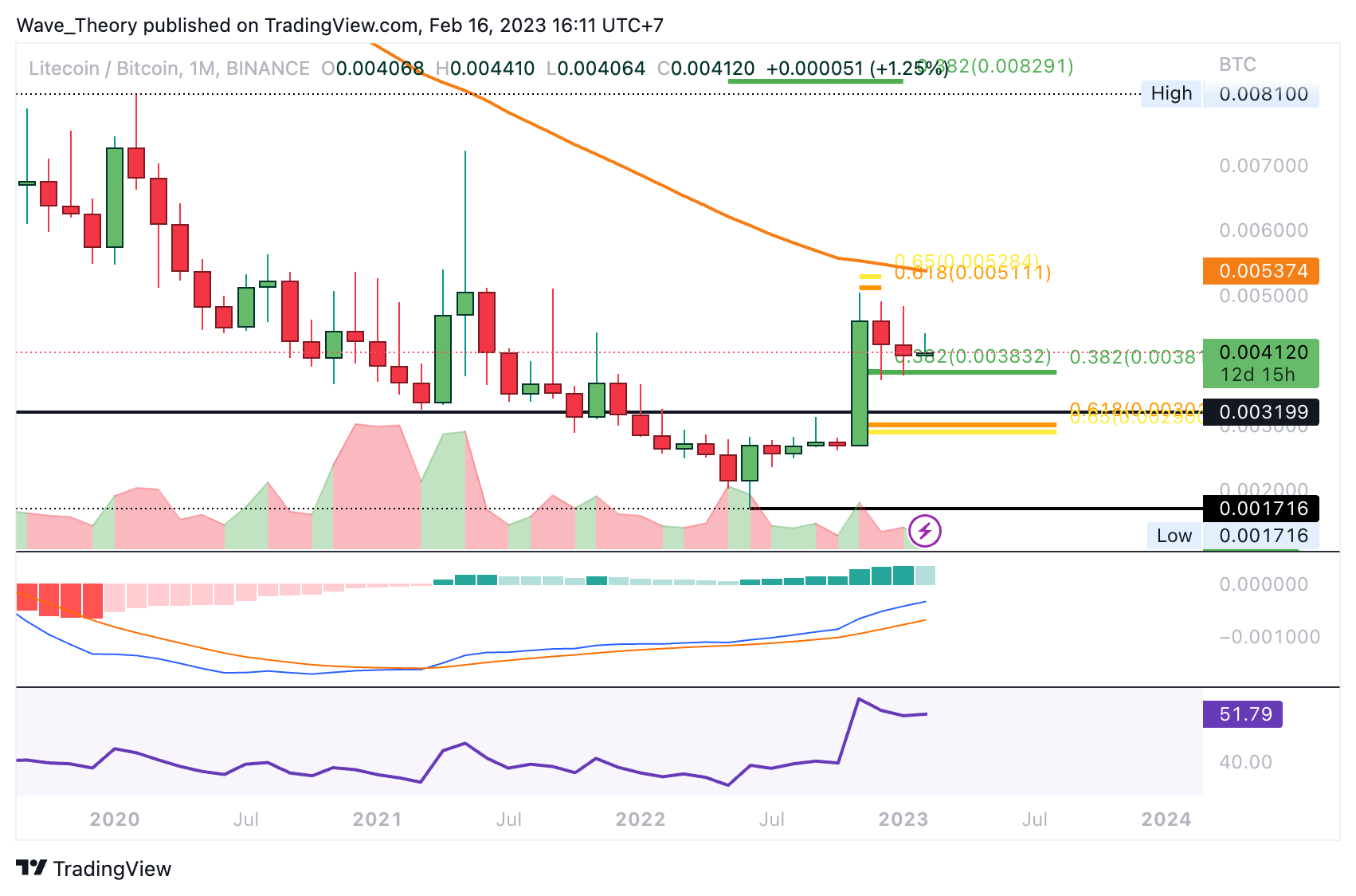 Gegen BTC konnte Litecoin an der 0,382 Fib Unterstützung bei rund 0,00383 BTC abprallen und sofern diese erfolgreich hält, wartet an der Golden Ratio bei rund 0,00525 BTC der nächste signifikante Fib Widerstand auf LTC. Ansonsten fungiert der 50-Monate-EMA bei rund 0,005375 BTC als zusätzlicher Widerstand.