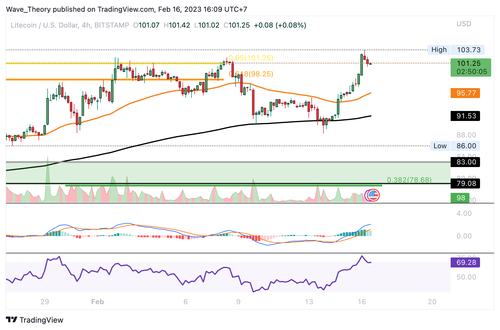 Kurzfristig könnte Litecoin zu den nächsten signifikanten Fib Unterstützungen bei rund 78,7 USD respektive 64 USD korrigieren. Ansonsten liegt im Tageschart aber immer noch ein Golden Crossover vor, womit der Trend kurz- bis mittelfristig bullisch bestätigt ist.”