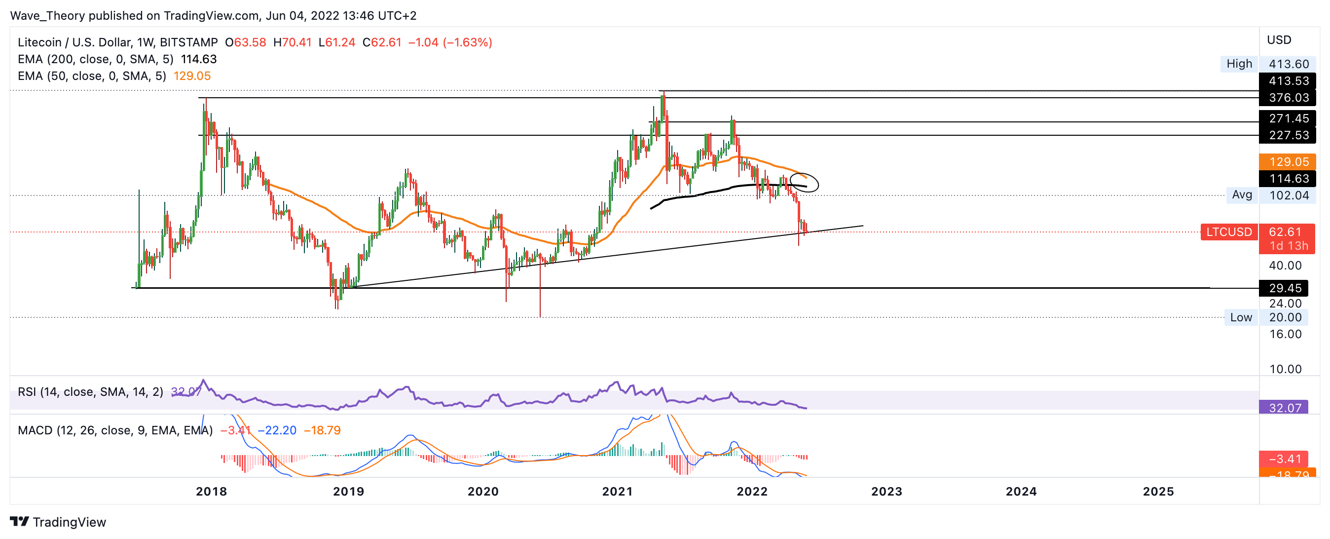 Ansonsten findet Litecoin erst wieder rund 43 % tiefer, zwischen 29 – 39 USD signifikante Unterstützung.
