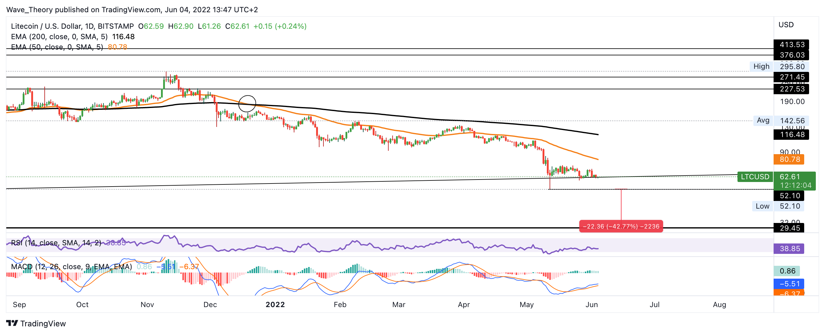 Im Tageschart etablierte sich bereits Ende 2021 ein Death Cross, womit der Trend kurz-bis mittelfristig bärisch bestätigt ist. Der RSI entwickelt sich nach oben, während sich der Litecoin Preis in den letzten Wochen seitwärts bewegt. Sollte sich dieses Muster fortsetzen, hat Litecoin eine Chance auf eine bullische Divergenz im RSI, woraufhin Litecoin stark in die Höhe schnellen könnte.