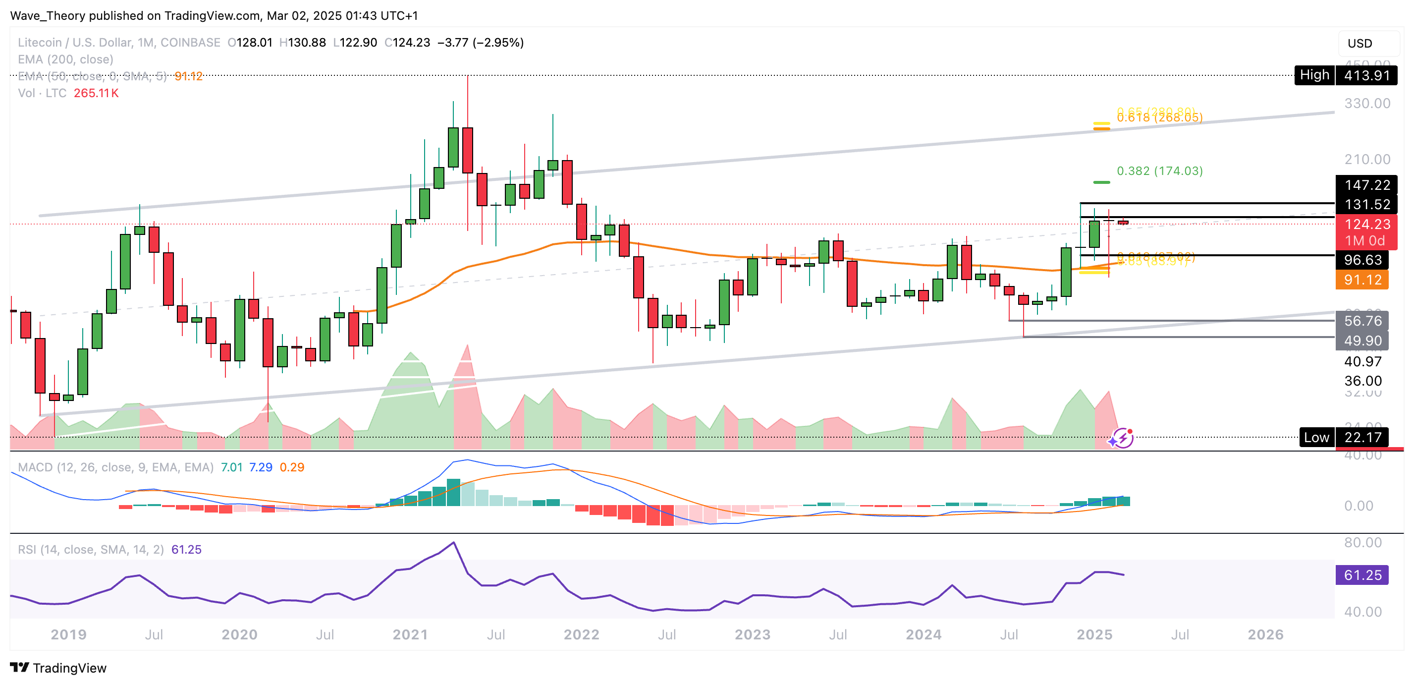 Doch noch im selben Monat konnte sich der Litecoin Preis fast vollständig erholen, nachdem er an der Golden Ratio Unterstützung am 50-Monate-EMA bei rund 87 USD bullisch abprallen konnte.