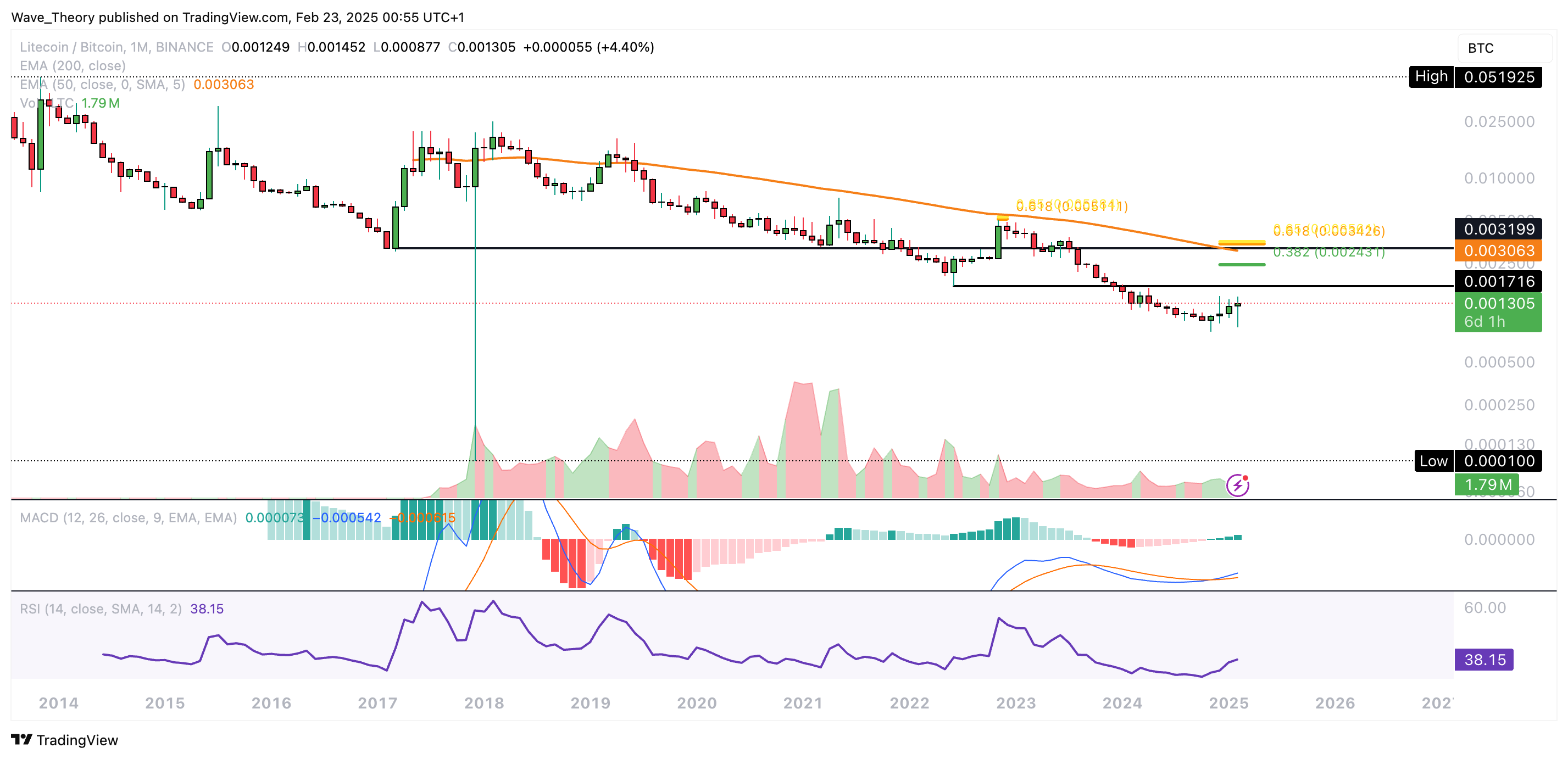 Sollte der LTC Kurs noch höher steigen, warten bei rund 0,00243 BTC und bei rund 0,0034 BTC die nächsten signifikanten Fibonacci Widerstände. Davon abgesehen zeigen sich die Indikatoren im Monatschart eher bullisch.