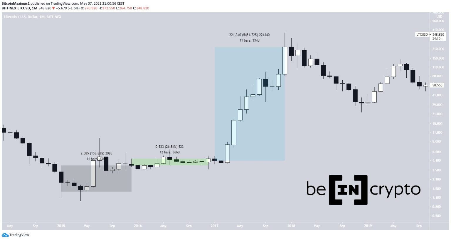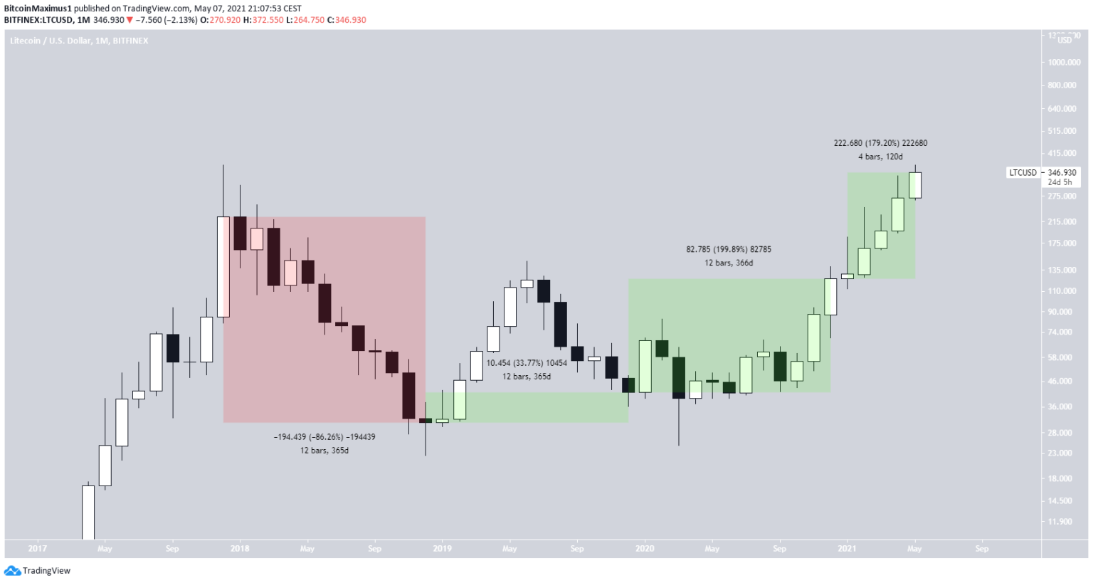 2020 war ebenfalls ein bullisches Jahr. Nach einer Korrekturphase, die sich zwischen Februar und März ereignete, erholte sich der LTC Kurs wieder und erzielte danach einen höheren Jahresschlusskurs (124 USD). Der LTC Kurs verdoppelte sich in diesem Jahr. Im Jahr 2021 hat sich der Preis (bis jetzt) um 195% nach oben bewegt. Zum Zeitpunkt der Veröffentlichung liegt der LTC Preis bei 393 USD.