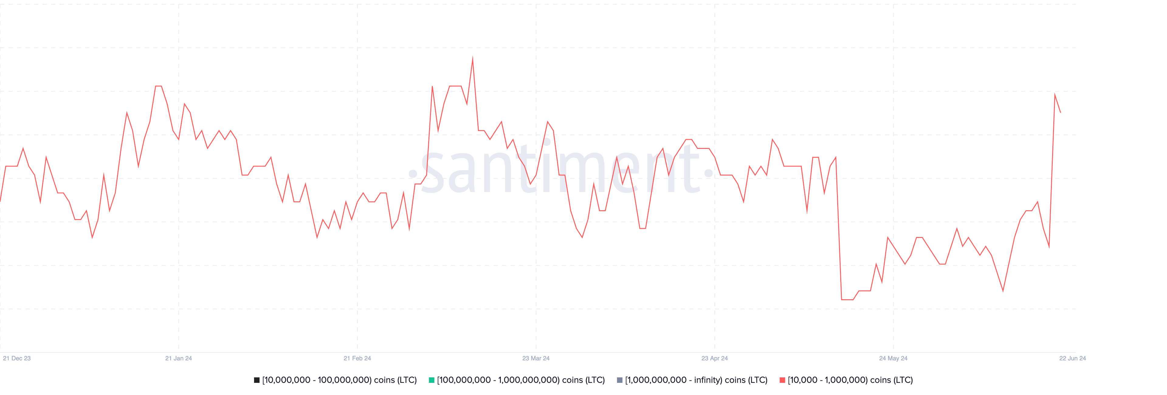 Seit Anfang Juni ist die Anzahl der LTC-Wale, die zwischen 10.000 und 1.000.000 Tokens halten, um zwei Prozent gestiegen. Zum Vergleich: Diese Gruppe von Investoren umfasst derzeit 613 Adressen, ein Hoch, das zuletzt im März beobachtet wurde.