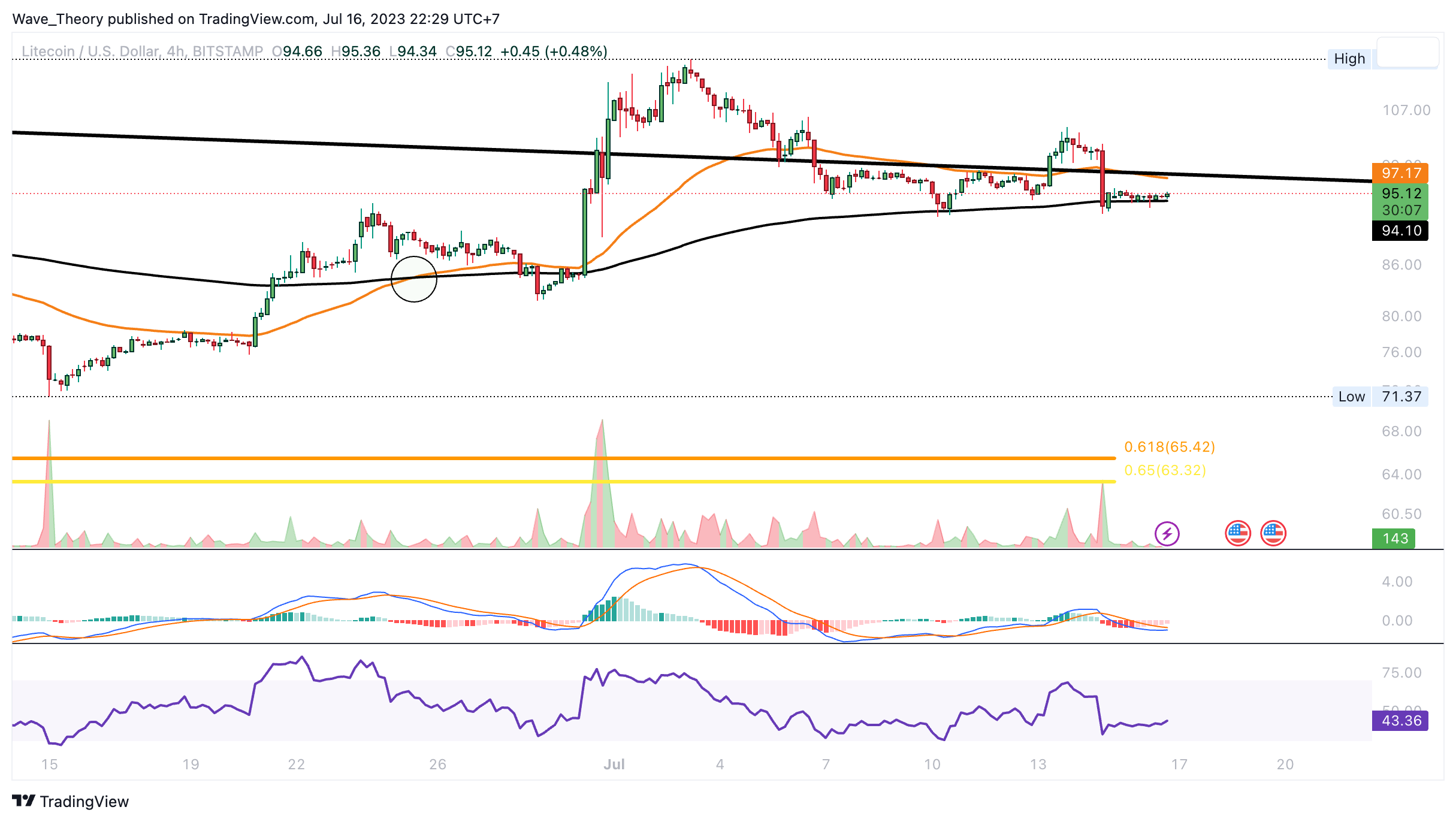 Das Histogramm des MACDs tickt dabei bullisch höher und auch die MACD Linien könnten sich jetzt bullisch überkreuzen. Im 4H-Chart sieht es kurzfristig also eher bullisch aus. Zudem scheint Litecoin aktuell am 200-4H-EMA bei rund 94 USD Unterstützung zu finden, woran der Kurs jetzt bullisch abprallen könnte.
