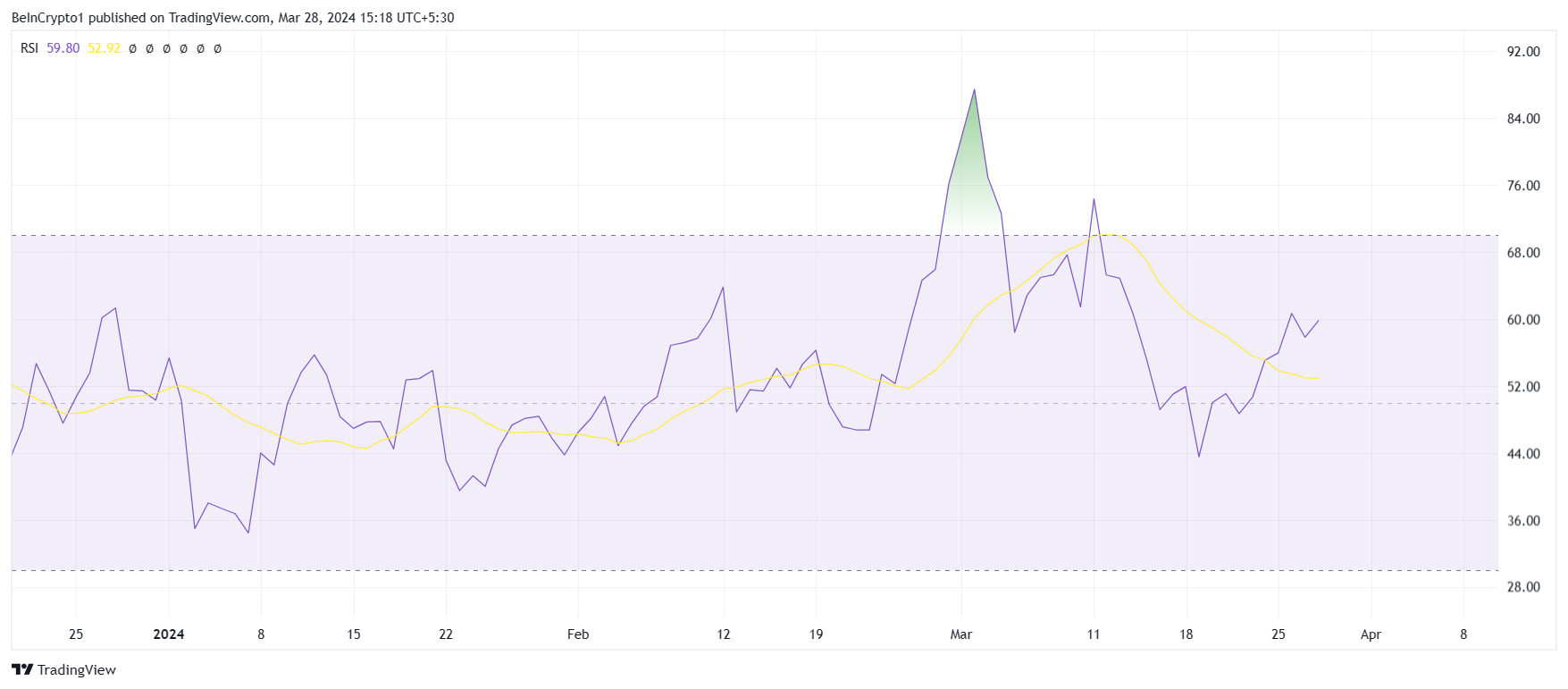 Darüber hinaus wird für den Altcoin bereits ein weiterer Anstieg erwartet, wie am Relative Strength Index (RSI) zu erkennen ist. Der RSI ist ein Momentum-Oszillator, der die Geschwindigkeit und Veränderung von Kursbewegungen misst und anzeigt, ob ein Vermögenswert überkauft oder überverkauft ist.