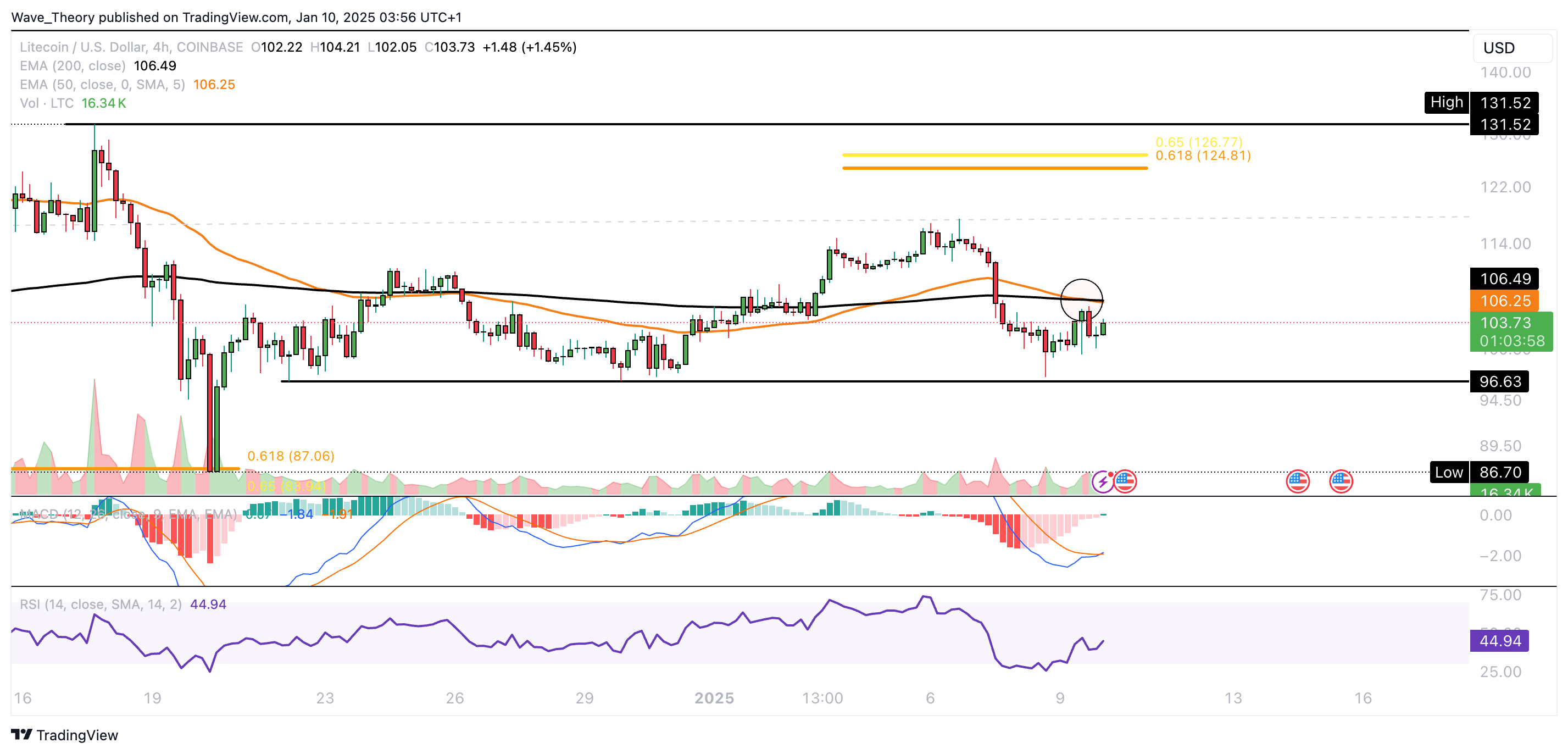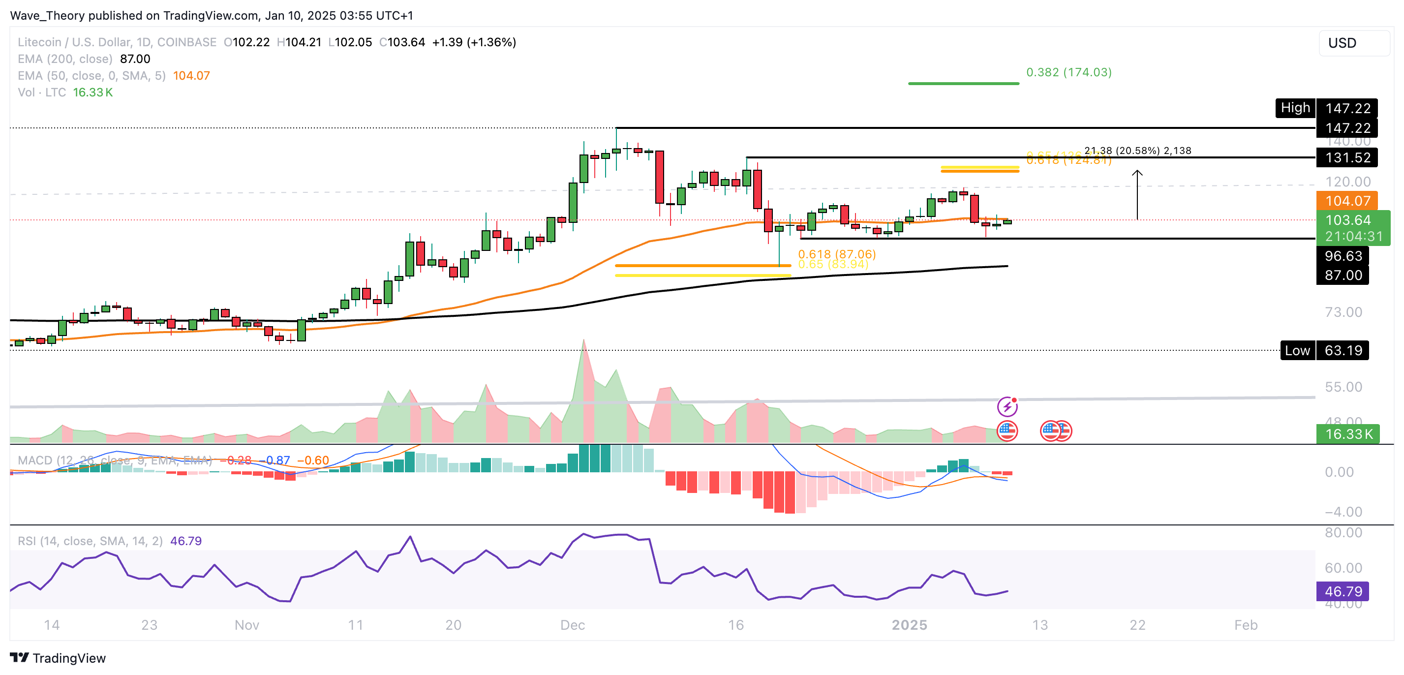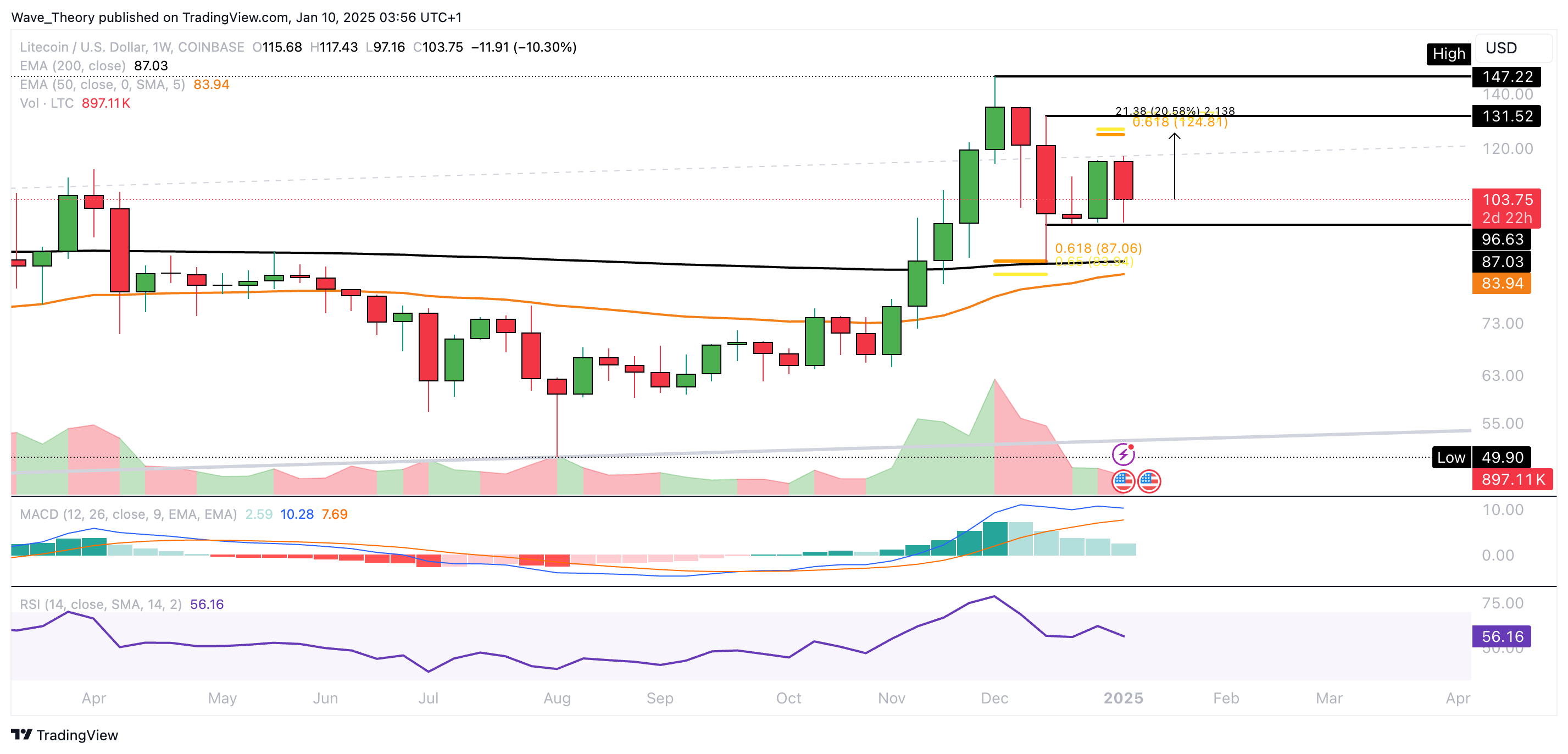 Der LTC Kurs formt tiefere Hochpunkte und höhere Tiefpunkte. Zuvor ist Litecoin von rund 147 USD auf rund 87 USD korrigiert, um dabei an der Golden Ratio Unterstützung stark bullisch abzuprallen.