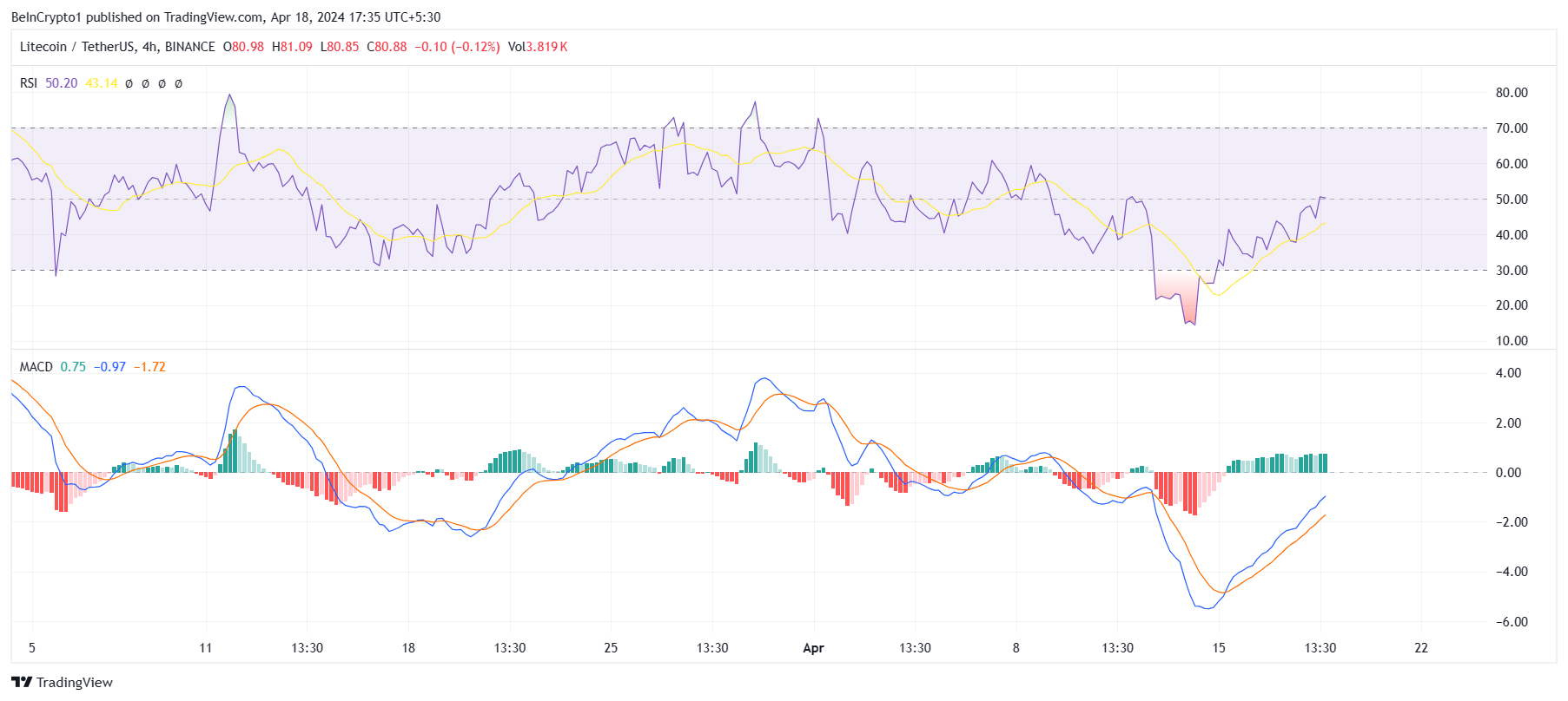 Der RSI steht kurz davor, die neutrale Linie bei 50,0 zu durchbrechen und eine zinsbullische Entwicklung zu verzeichnen. Auch der MACD zeigt derzeit eine steigende Tendenz, die den LTC in Richtung Erholung treiben könnte.