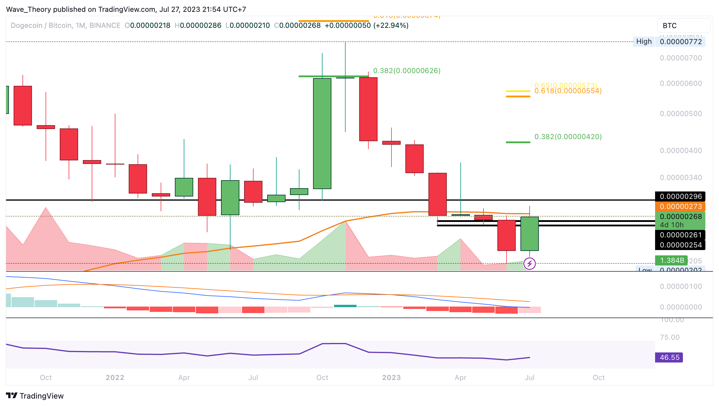 Gegen BTC hat Dogecoin derzeit gute Chancen, eine “Bullish-Engulfing-Candle” im Monatschart zu formen. Denn die Monatskerze schließt in wenigen Tagen. Extrem bullisch wäre es, wenn der Kurs über dem 50-Monate-EMA bei rund 0,00000273 BTC schließt.