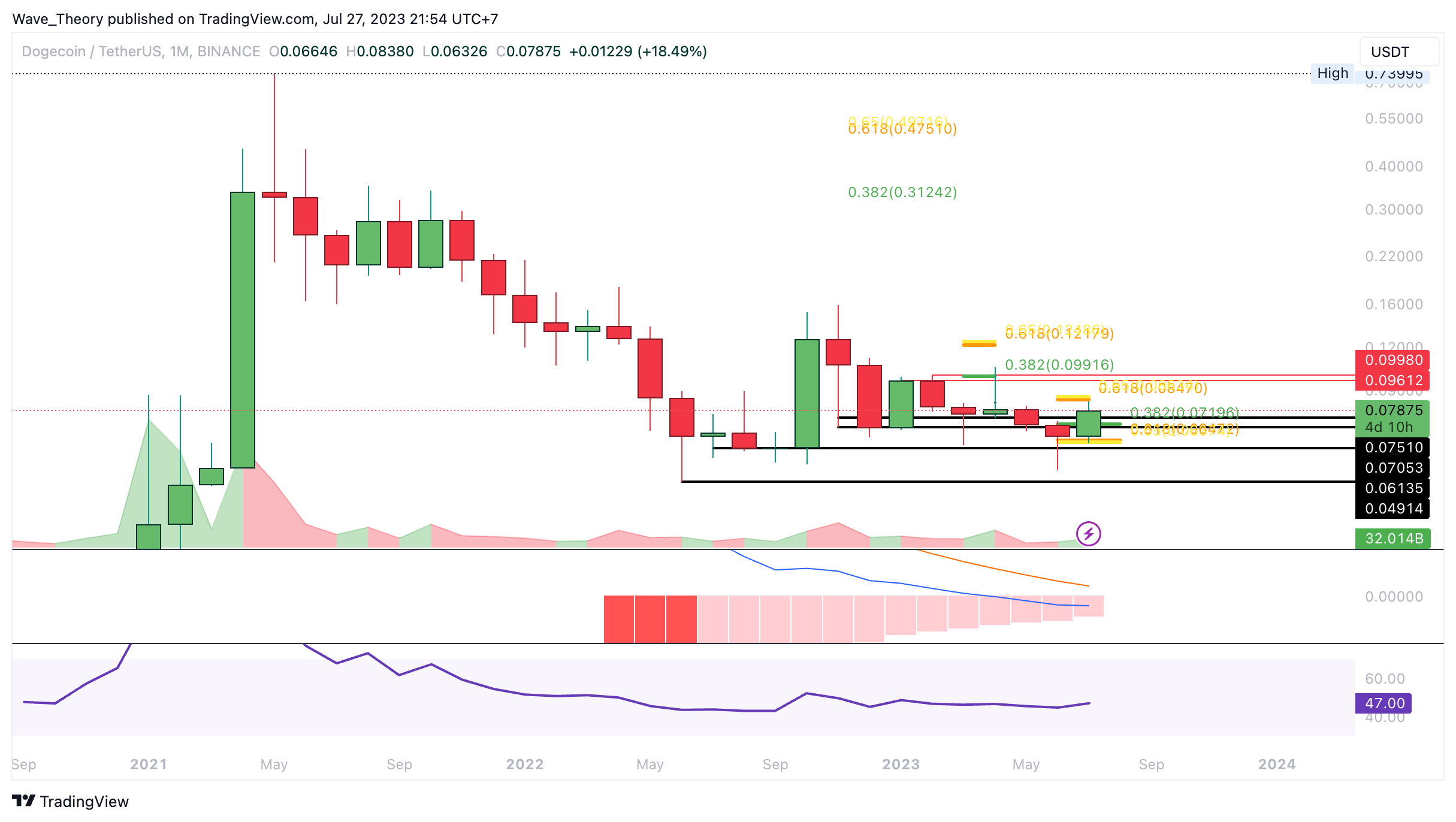 Der Juli verläuft bisher sehr bullisch für den Dogecoin Kurs. Darüber hinaus tickt das Histogramm des MACDs seit vielen Monaten bullisch höher, womit sich auch die MACD Linien bald bullisch überkreuzen könnten. Der RSI bewegt sich währenddessen in neutralem Gebiet. Wenn Dogecoin den Widerstandsbereich zwischen rund 0,096 USD und 0,1 USD bricht, wartet bei rund 1,2 USD der nächste signifikante Fib Widerstand.