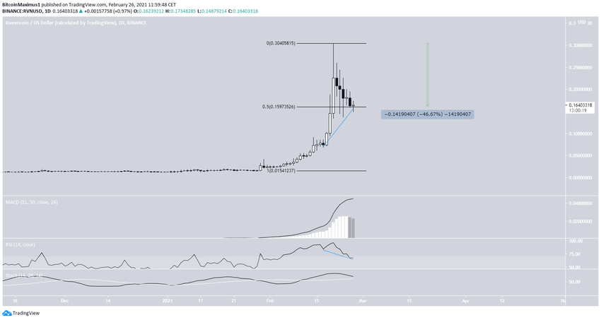 Am 20. Februar hat der RVN Preis sein neues All-Time High bei 0.30 USD erreicht. Anschließend ist er um ca. 45% gefallen. Zum Zeitpunkt der Veröffentlichung wird der RVN Kurs bei ca. 0.16 USD gehandelt und befindet sich in der Nähe des 0.5-Fib-Retracement-Levels.