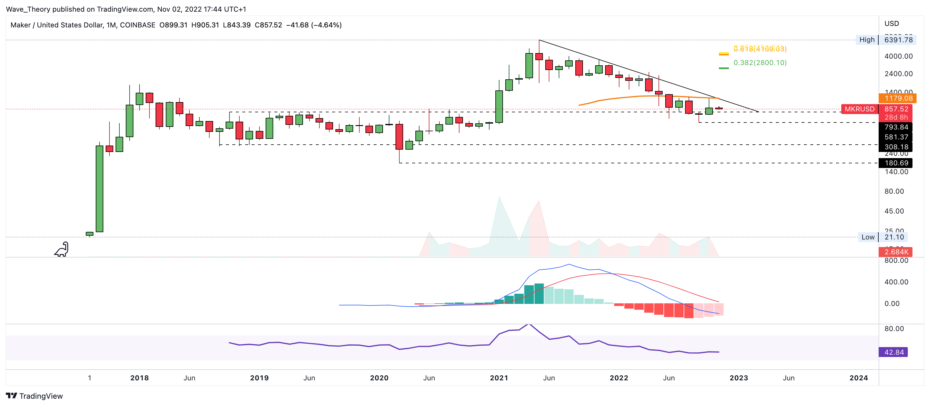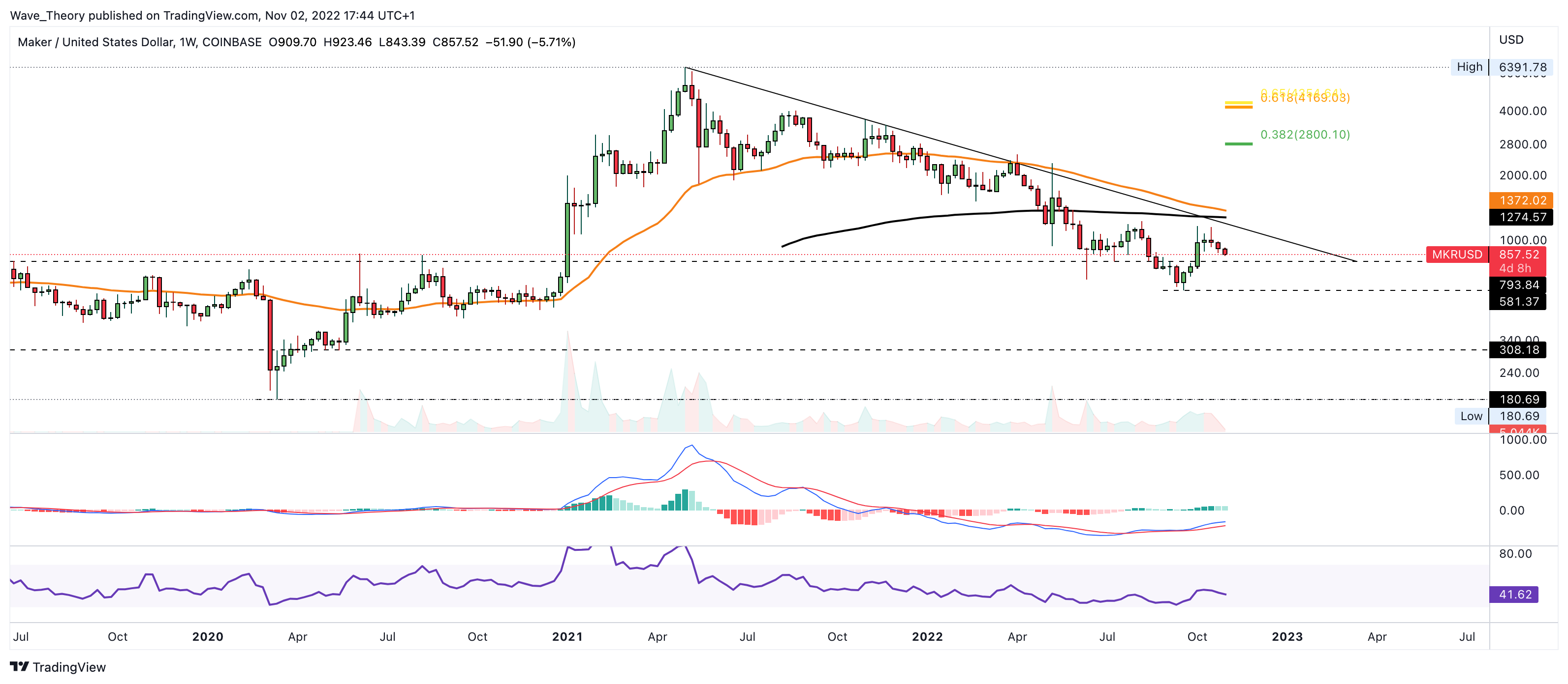 Sollte Maker jetzt bei rund 800 USD bullisch abprallen, um die Aufwärtsbewegung fortzusetzen, stößt Maker bei rund 1.275 USD auf den entscheidenden Widerstand. Denn wenn Maker diesen Widerstand bricht, ist die bärische Trendlinie des gesamten Bärenmarktes überwunden!