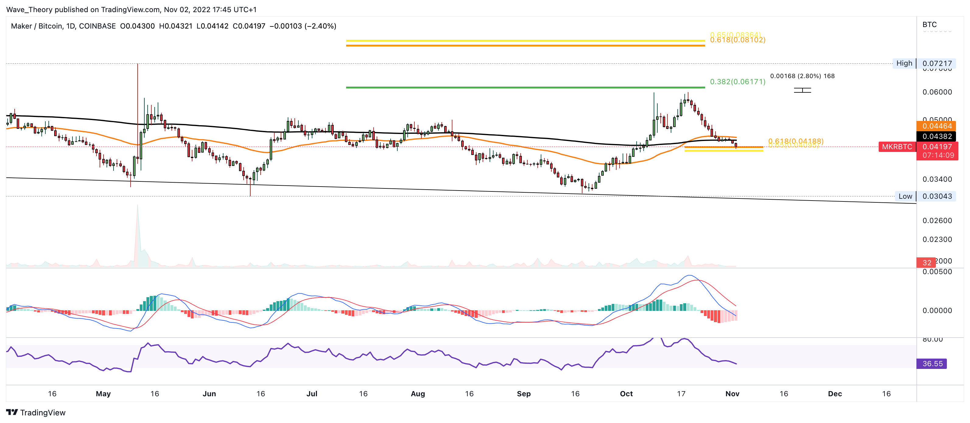 Gegen BTC stößt der Maker Kurs jetzt auf Golden Ratio Unterstützung bei rund 0,0415 BTC