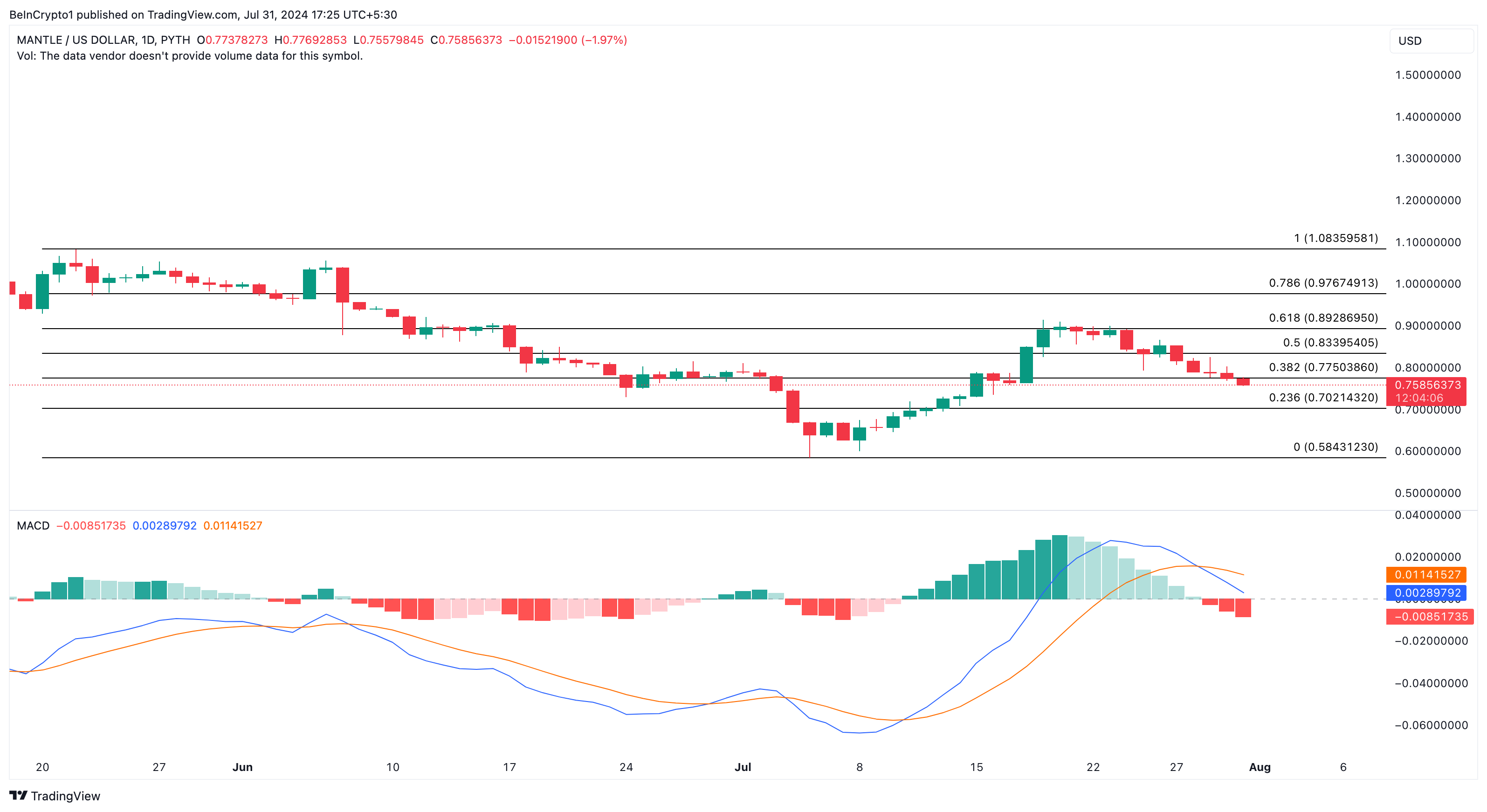 Sollte der Trend anhalten, könnte MNT einem weiteren Rückgang nicht entkommen, und die Fibonacci-Retracement-Serie gibt eine Vorstellung von den Ebenen, die der Token erreichen könnte. Sollte der Verkaufsdruck zunehmen, könnte der Kurs von MNT auf 0,70 USD fallen — dort liegt das 23,6-Prozent-Fib-Niveau.