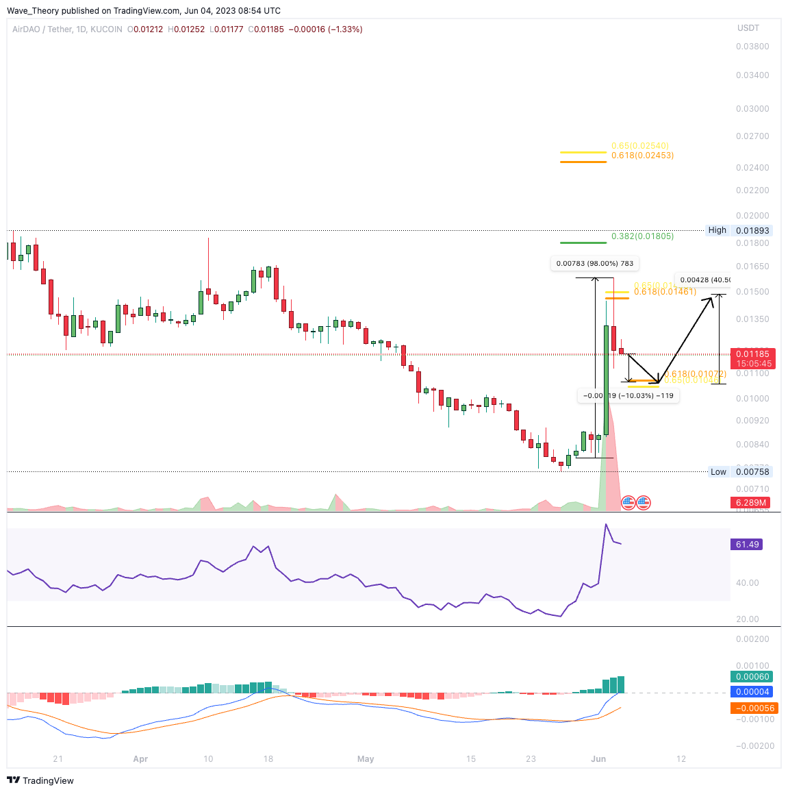 Der Coin AirDAO (AMB) hat sich in dieser Woche fast im Kurs verdoppelt. Denn der Coin ist in dieser Woche rund 98 % im Kurs gestiegen. Doch in Zuge des heftigen Kursanstiegs stieß AMB auf signifikanten Widerstand an der Golden Ratio bei rund 0,015 USD. Dort wurde der AMB Kurs bärisch abgewiesen, womit der Kurs jetzt zur Golden Ratio Unterstützung bei rund 0,01 USD korrigieren könnte.