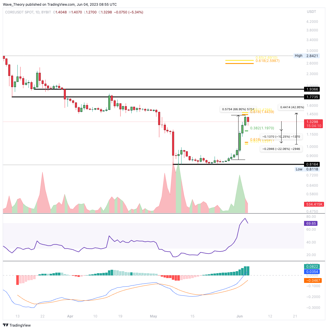 SponsoredDort angekommen, könnte der Kurs aber stark abprallen, um erneut zur Golden Ratio bei rund 1,45 USD zu steigen. Damit könnte der Core Kurs schon bald bis zu 43 % steigen.