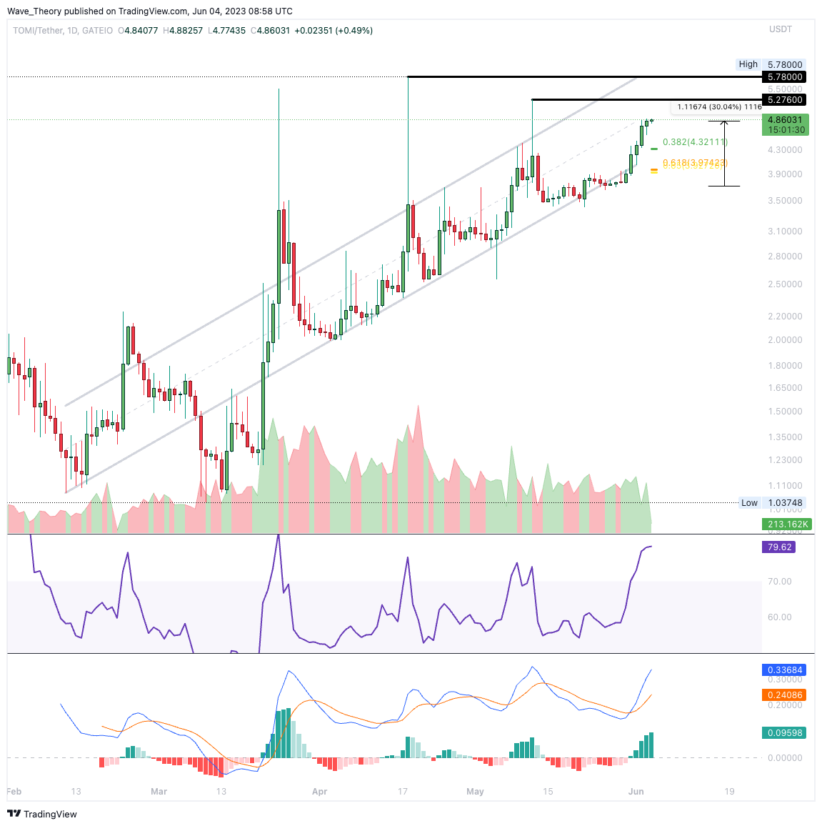 Sollte der TOMI Kurs jetzt korrigieren, warten bereits bei rund 4,32 USD und bei rund 3,95 USD die nächsten signifikanten Fibonacci Unterstützungen. Ansonsten weist der TOMI Kurs aber seit Monaten einen beeindruckenden Aufwärtstrend auf.