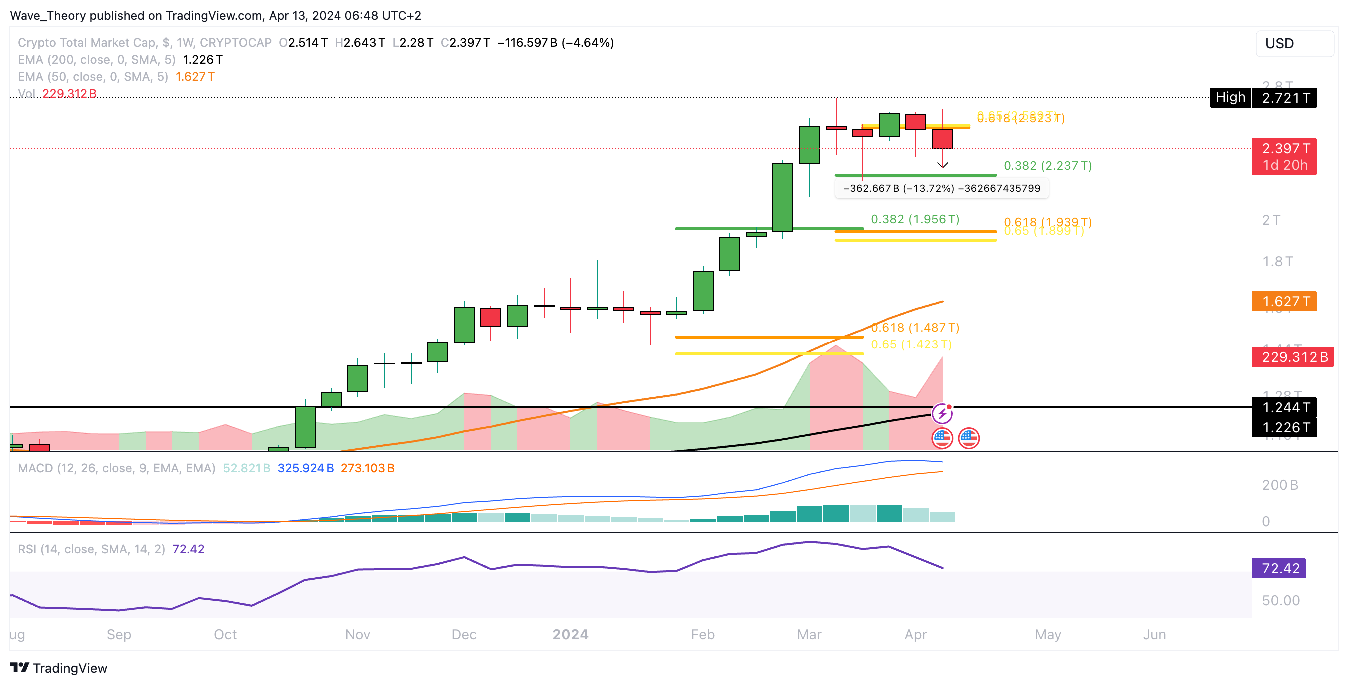 Der Krypto-Markt ist in dieser Woche um fast 14 % gefallen und hat damit über 363 Milliarden USD an Marktkapitalisierung verloren. Tatsächlich könnte der Krypto-Markt noch tiefer fallen, denn erst bei rund 2,237 Billionen USD wartet die nächste signifikante Fib Unterstützung.